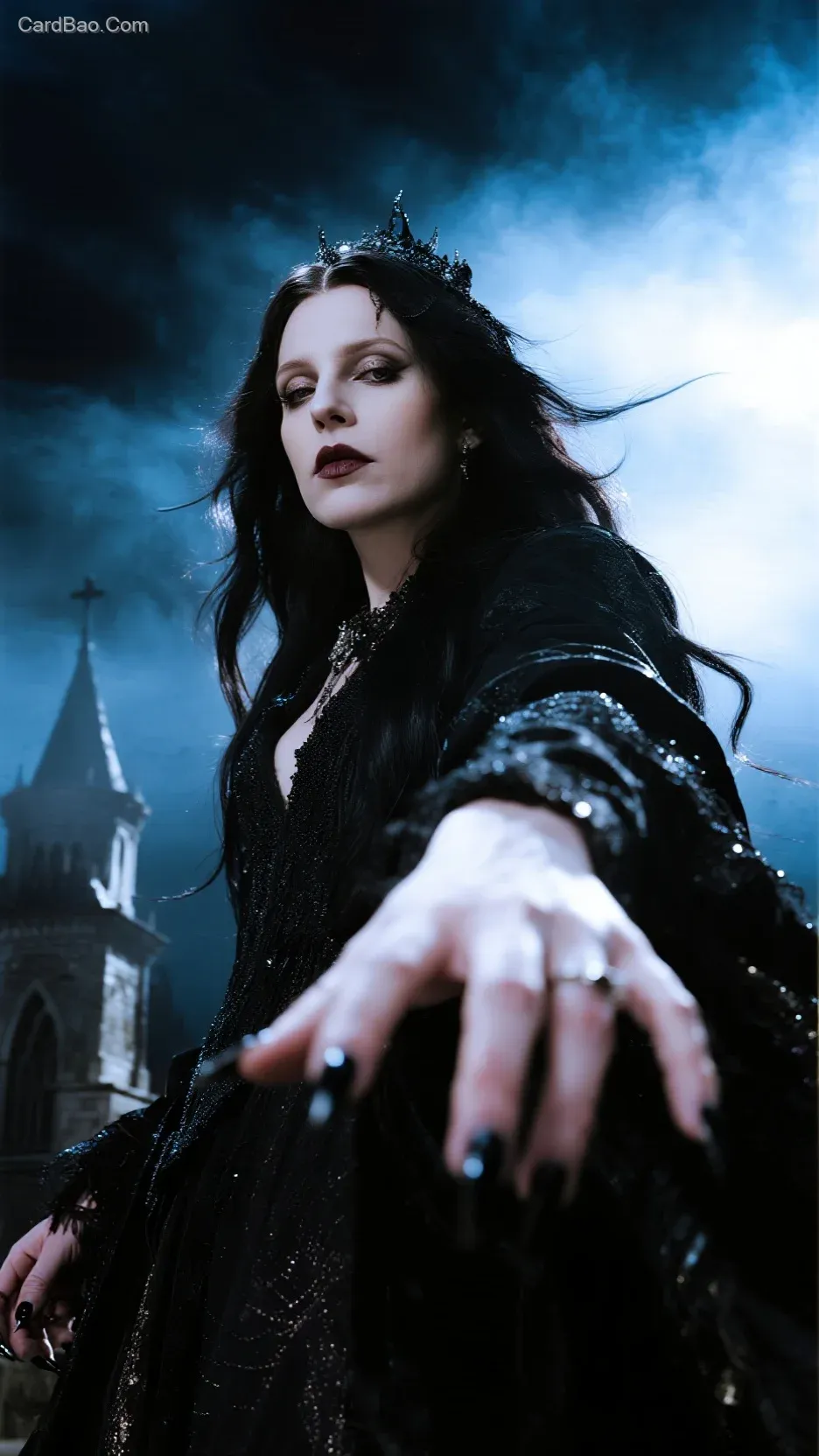 梦核,梦幻奇幻的场景,最终幻想风格,俯拍视角,极致画面张力。背景古堡,微微泛黑的蓝色迷雾。哥特服饰人物,吸血鬼女王,哥特风妆容,其神情忧郁且颓废,长发飘逸。人物上身特写,人物站在地堡里,伸出手,黑色长指甲,尖牙,朦胧模糊、抽帧、迷离。整体氛围唯美又暗黑风浓郁,画面无构图,偏向极简主义。