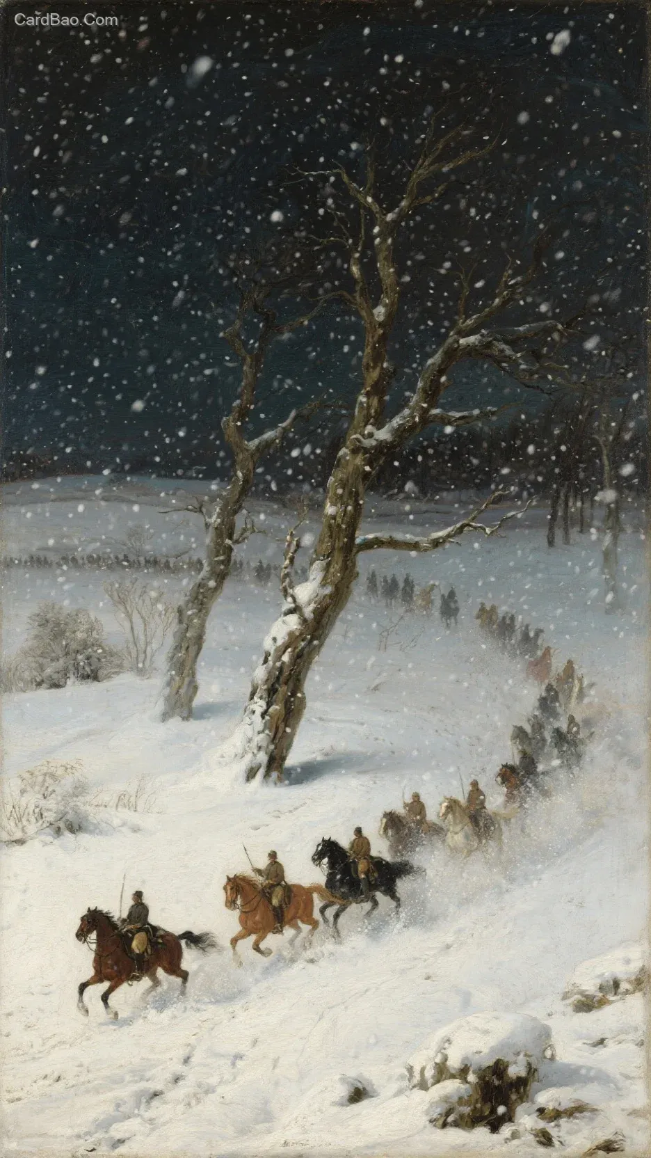 深冬夜晚,密集的大雪纷飞,俯视角度,茫茫原野上,几棵枯树高高矗立,一群骑兵从远处疾驰而来!马蹄纷乱践踏,激起雪沫,油画写实风格伦勃朗
