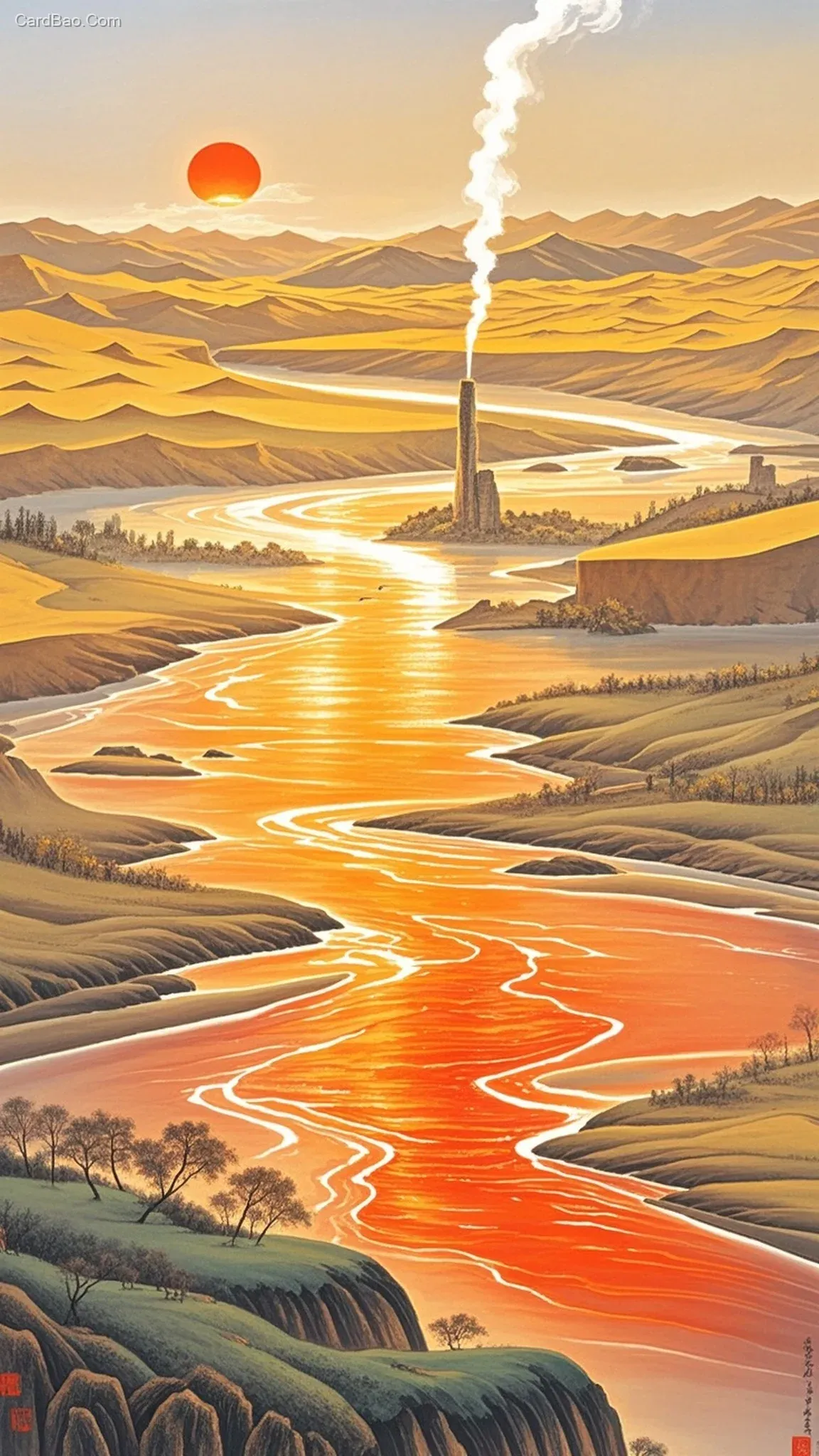 **"A solitary smoke rises straight in the vast desert, the setting sun is round over the long river. Use this line to generate a painting and write a copy."**