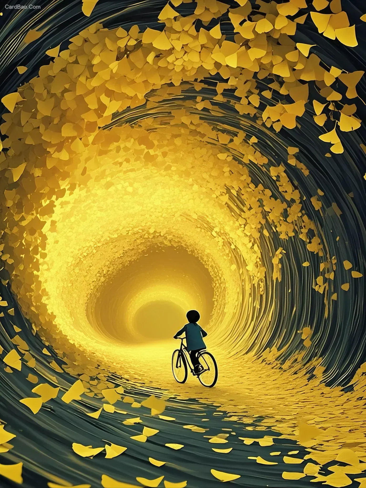 ## An 8K ultra-high-definition artistic image featuring a child riding a bicycle at the center, surrounded by a spiral tunnel made of golden ginkgo leaves. Each ginkgo leaf is intricately detailed, with visible veins and textures, arranged in a spiral pattern to create a strong sense of motion and depth. Warm, dreamy autumn light pours in from the end of the tunnel, enhancing the enchanting atmosphere. The child and bicycle are sharply outlined with exquisite details, while the entire composition is rendered in stunning 8K resolution with rich, vibrant colors, delivering a poetic and whimsical visual experience that blends childhood wonder with artistic finesse.