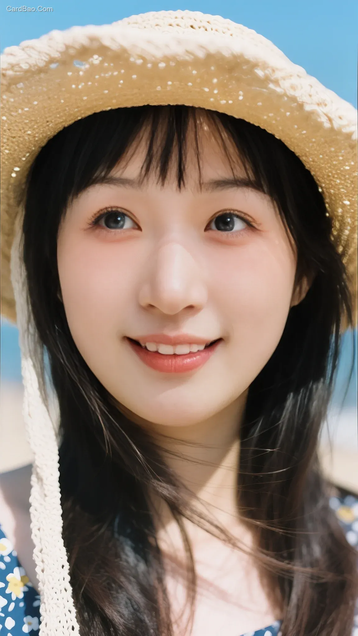 ##一张拍立得相片,大阳光,不清晰,大颗粒质感,柯尼卡胶卷质感,模糊,过度曝光,蓝调,近镜头脸部拍摄,眼睛特写,美少女,夏天,微风,阳光晒脸上,长发,沙滩草帽遮一半阳光,突显头发凌乱美,灵动,水润的唇微微张开,有拍摄日期