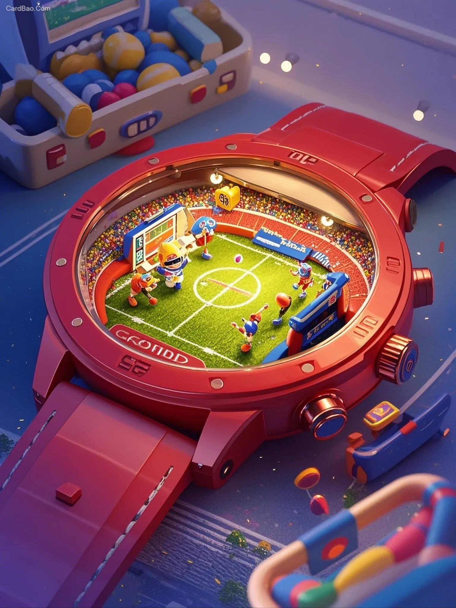 This is a digital art work of a giant cartoon red watch worn on the arm,and inside the watch is a round football field where mini football matches are being played,with a track and spectator stands,which are brightly colored. Very close up shots. Focusing on the football field,