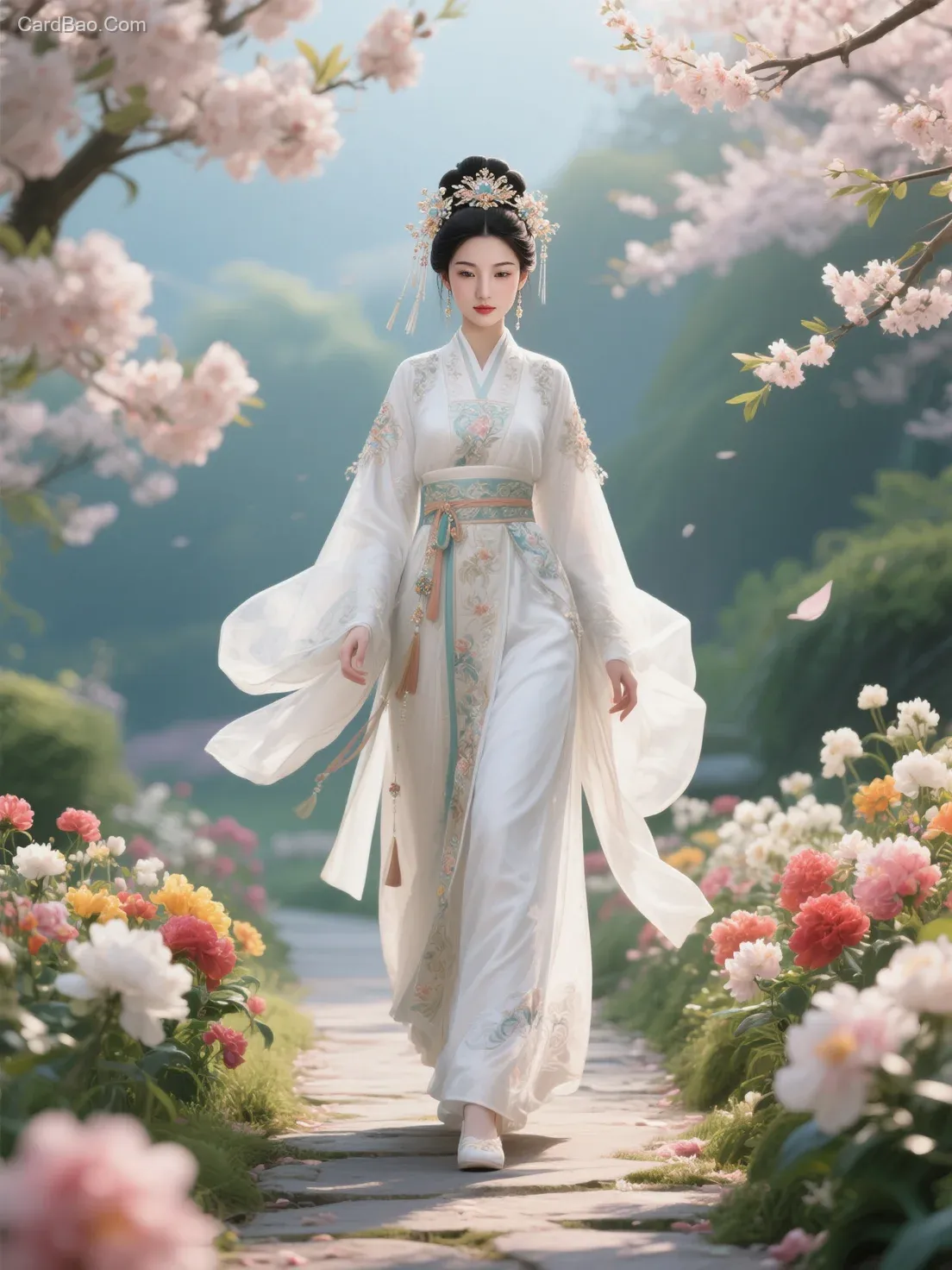 ## Ancient-style illustration, new 3D, a beautiful woman wearing a gorgeous white Hanfu walking on a flower path, exquisite headdress, half-body close-up, spring scenery, with flowers, vibrant colors, matte texture, 3D rendering, OC rendering, high definition, aesthetic, different angles, masterpiece, 16K