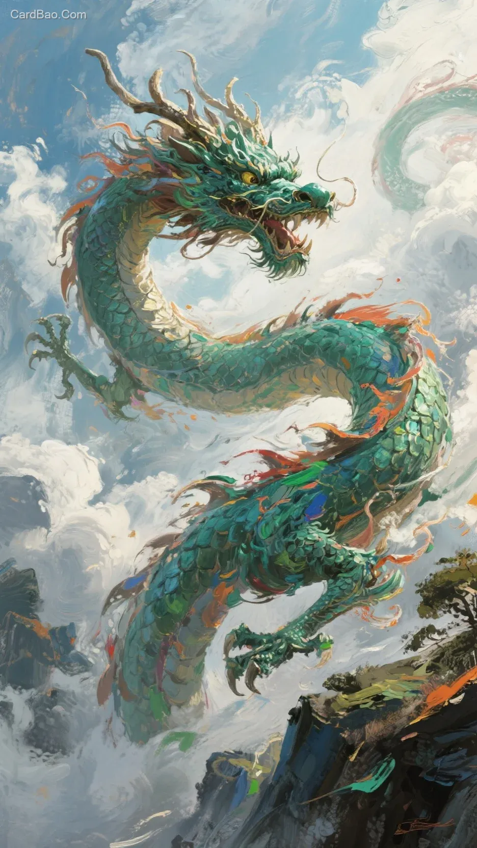 丙烯厚涂,颜料堆砌,肌理感,颜料迸发,立体感,笔触感,极致细节刻画,光影效果,场景塑造丰富,神话传说,神兽青龙,威风凛凛,在天空盘旋,云雾缭绕,极致合理的构图,特写,动态