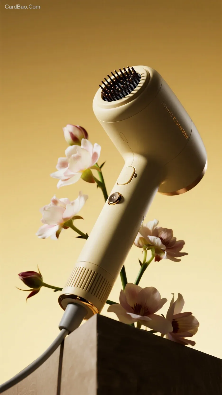 The image features a light yellow metal curling iron with a simple and sleek design, complete with a metal button. The curling iron is placed on the edge of an elevated display stand, surrounded by blooming flowers that do not exceed the height of the stand. The background is a soft yellow, viewed from a low-angle perspective, with an overall dark tone and subtle lighting effects that primarily highlight the curling iron. This creates an elegant, sophisticated, and high-end ambiance, emphasizing the product's beauty and care attributes as well as its premium quality. The image boasts ultra-high-definition details and is rendered in C4D.