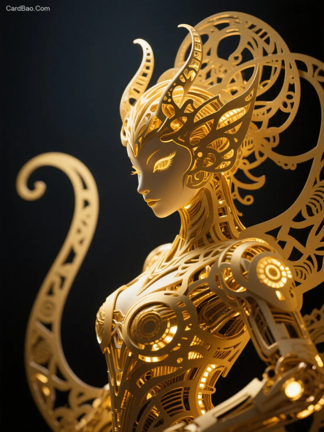 机械立体妲己剪纸艺术,侧45度,金色为主,深色背景,镂空雕刻细节处透灯光,边缘灯光,细节超凡,想象力巨大,夸张,大片质感,超现实主义,微距拍摄,超高清32k,黄金
