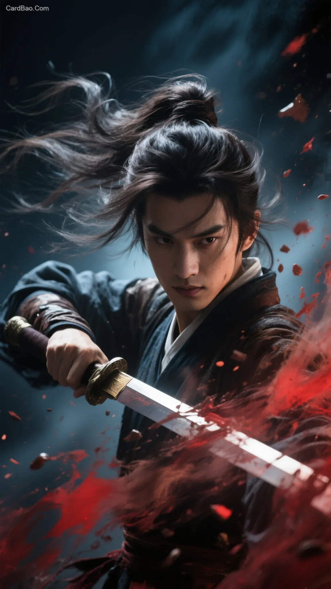 超高清情绪摄影,视觉冲击,黑暗洒红蓝褐,水墨气体,粒子飞溅,高景深,虚实层次,完美光影,笔触飘逸。大师作品,暗黑美学。武侠特写,头发飘动,劲装,持剑,强动态姿态,面容冷峻,强伦布朗光,轮廓光,冷暖对比