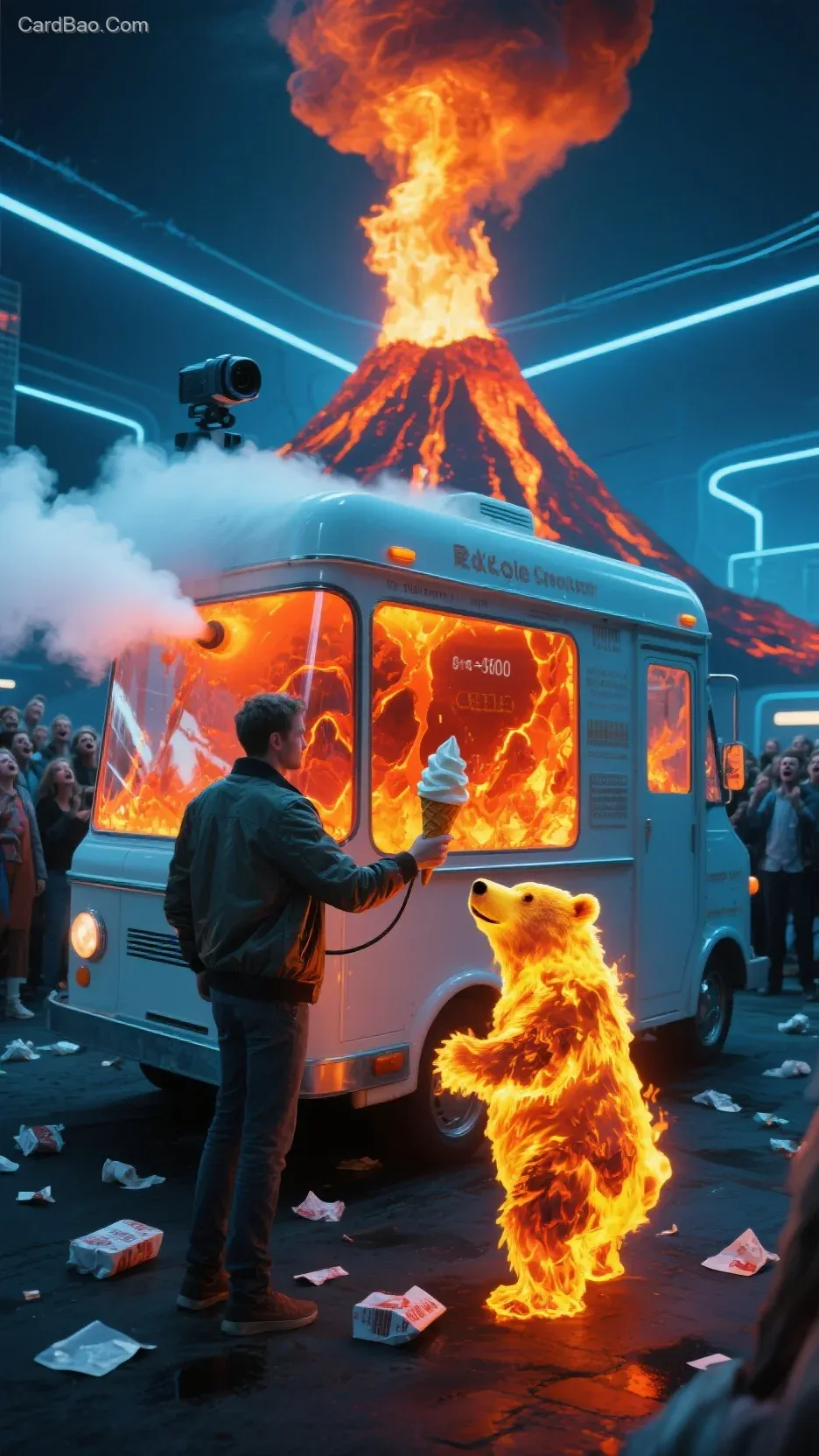 /imagine prompt: 在一个充满科技感与危险氛围的场景中,以9:16的画面比例展示《岩浆冰淇淋车》。一辆经过改装的雪糕车位于画面中心,车正喷射出液氮白雾,白雾浓密且呈现出冰冷的蓝色调,如同梦幻般的云雾缭绕车身。车身镶嵌着岩浆感应玻璃,当温度>800℃时,玻璃呈现出熔岩态,此刻玻璃内岩浆正熊熊燃烧,流动的岩浆色彩鲜艳,橙红与亮黄交织,散发着炽热的光芒。在车旁,一位观众手持液氮急冻的火山岩冰淇淋,正要触碰车身,瞬间触发玻璃内岩浆流爆燃,爆燃产生的火焰冲向天空,火光四射,照亮周围的雾气。同时,热成像摄像头将人体温度转化为冰淇淋融化速度,以抽象的线条和色彩投影在浓雾中,投影与周围的场景相互融合,营造出一种奇幻而紧张的氛围。雪糕车周围的地面上有一些散落的包装纸,远处有一些围观的人群,他们脸上露出惊讶与兴奋的表情。 --ar 9:16 --v 6.0