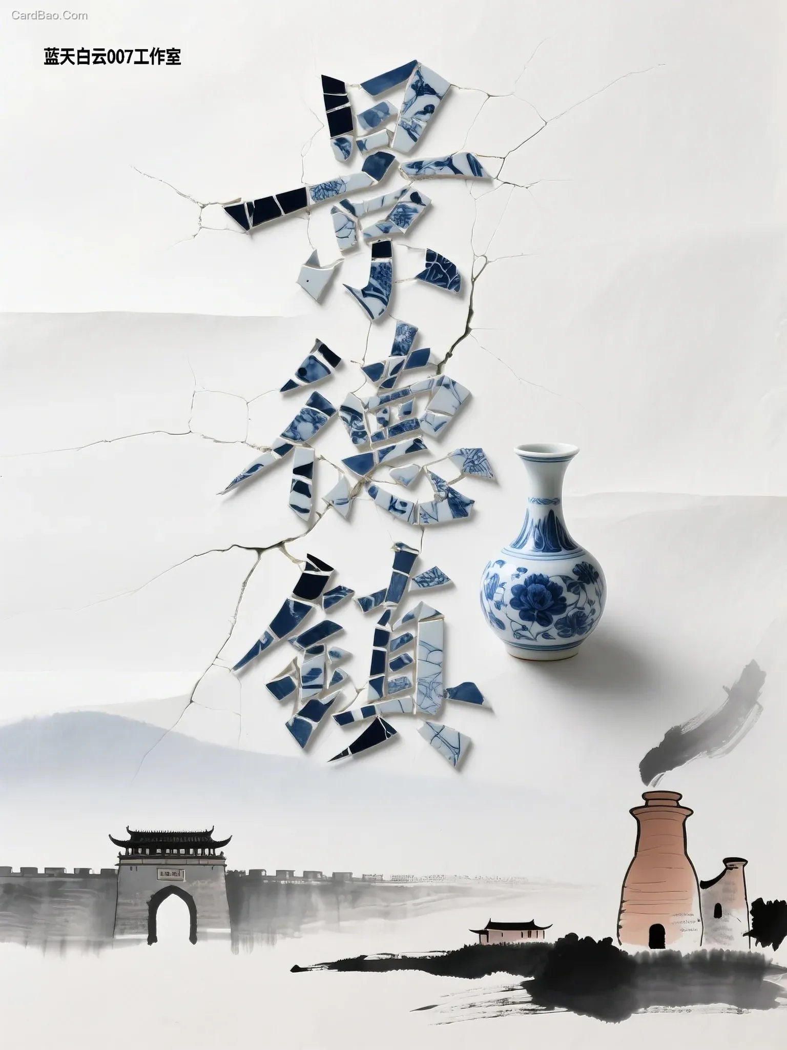 现代水墨风格字体海报,"景德镇"立体毛笔字,每一笔笔画都是由青花瓷碎片组成,融合青花瓷裂纹质感,旁边有一个青花瓷陶瓷瓶,下面加入水墨画瓷窑和城门楼,顶部左侧有较小字“陶瓷”两字,背景采用月白色渐变宣纸底纹,营造禅意空间,高清晰度