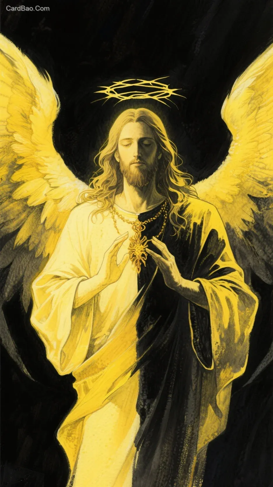 暗黑,水彩画,张扬,黄,黑,米迦勒,阴暗画风,神圣基督耶稣,妖冶美丽诱惑的堕落天使,对立构图,视觉冲击力。