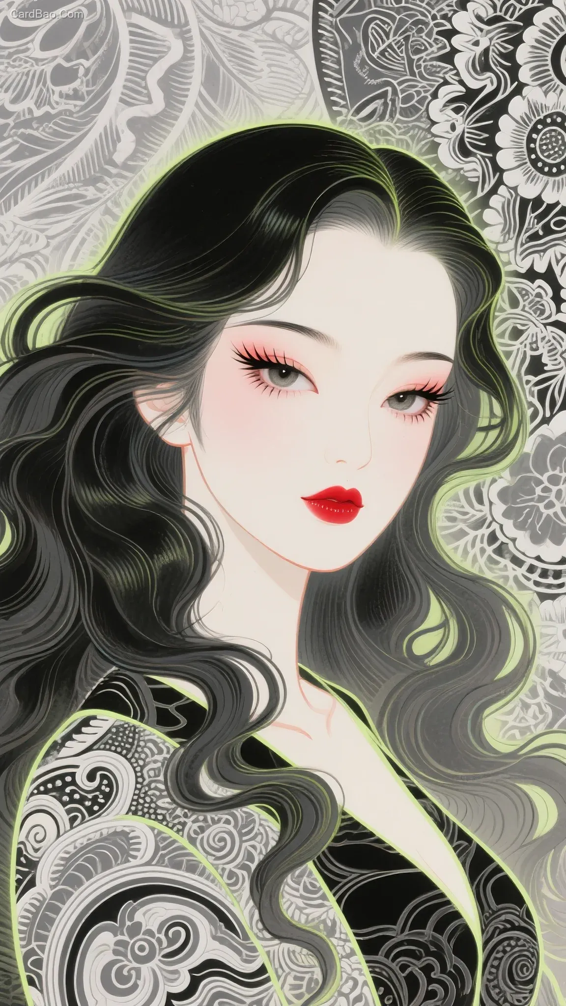 Stunning beauty, with thick eyebrows and big eyes, long eyelashes, red lips, and long wavy hair. A fusion of modern fashion and traditional batik, featuring Chinese-style illustration with fluorescent textures, a gray color palette, ultra-detailed elements, traditional patterns, the highest quality, and a hand-painted illustration style.