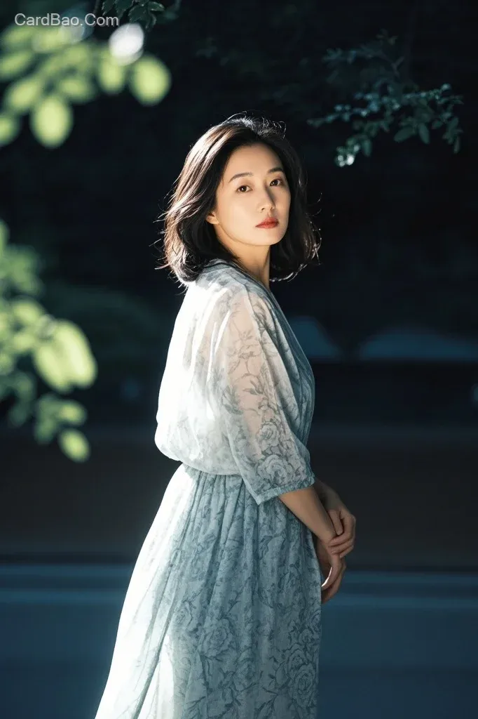 Kishin Shinoyama's artistic style, portrait photography, middle-aged woman, gaze and expression, body language, mature charm, emotion, summer wild roses, sunset, texture, soft focus, out of focus, high saturation, unique perspective, masterful composition, distinctive interpretation of femininity, delicate graininess, cool lighting, dark aesthetic, Tyndall effect cutting through shadows, geometric interplay of light and dark, backlighting, grainy noise, vintage soft focus, traditional Eastern ramie long dress, lightweight summer attire, minimalist composition, extreme play of light and shadow and color, meticulous detail representation, timeless masterpiece.