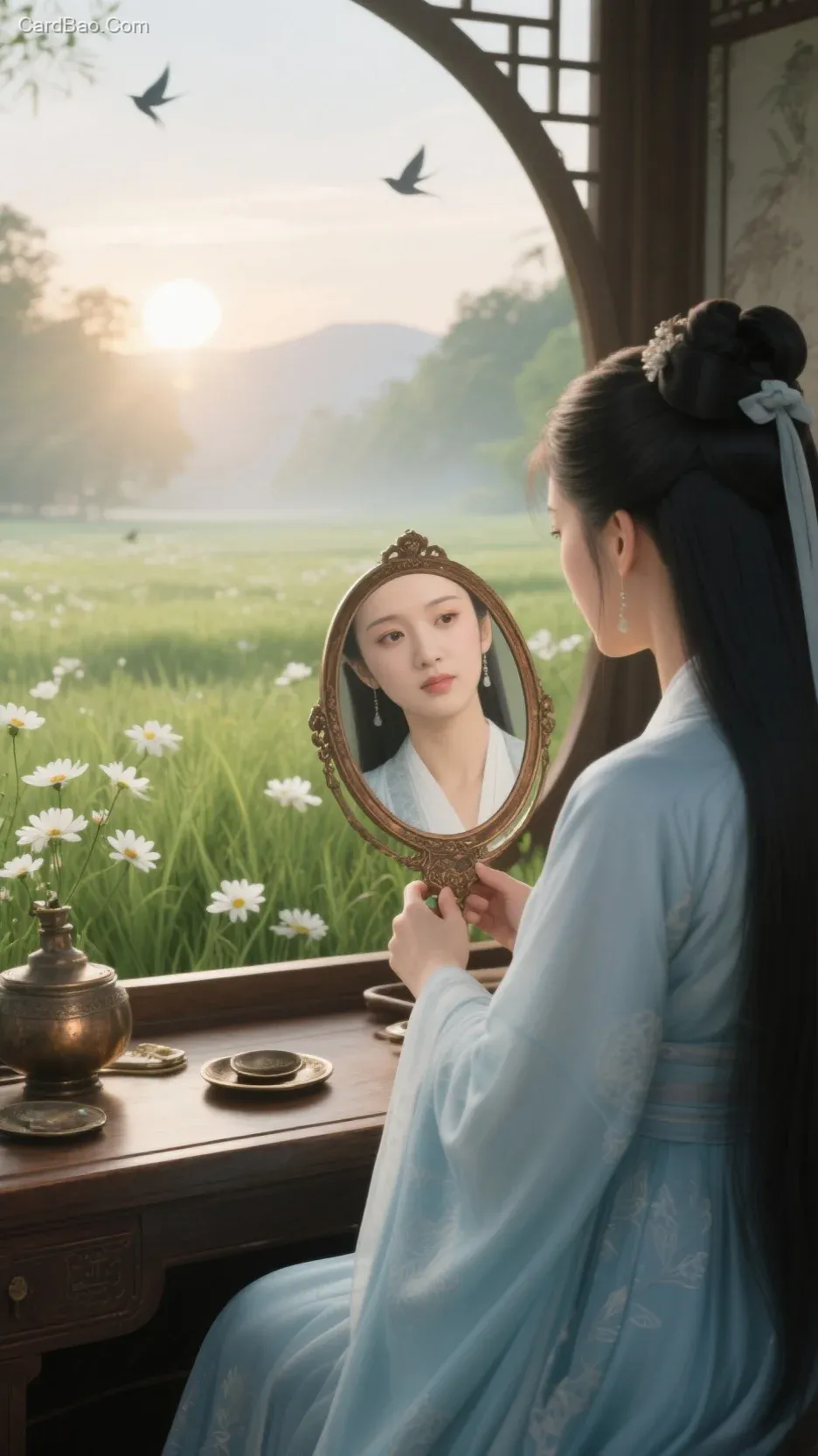 2 | Medium Close-Up | A graceful woman in a light-blue ruqun (traditional Han Chinese dress) with subtle patterns sits at a dressing table, her long hair dark as ink. | 2s | None | Subtle ambient indoor sounds