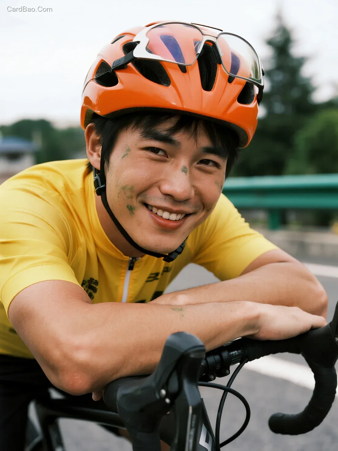 健壮的小伙,带橘黄色自行车头盔,眼镜插在头盔上,微笑,疲惫,面部有浮灰,面部特写,黄色骑行服,手臂自然压在车把上休息,画面下方露出一部分自行车