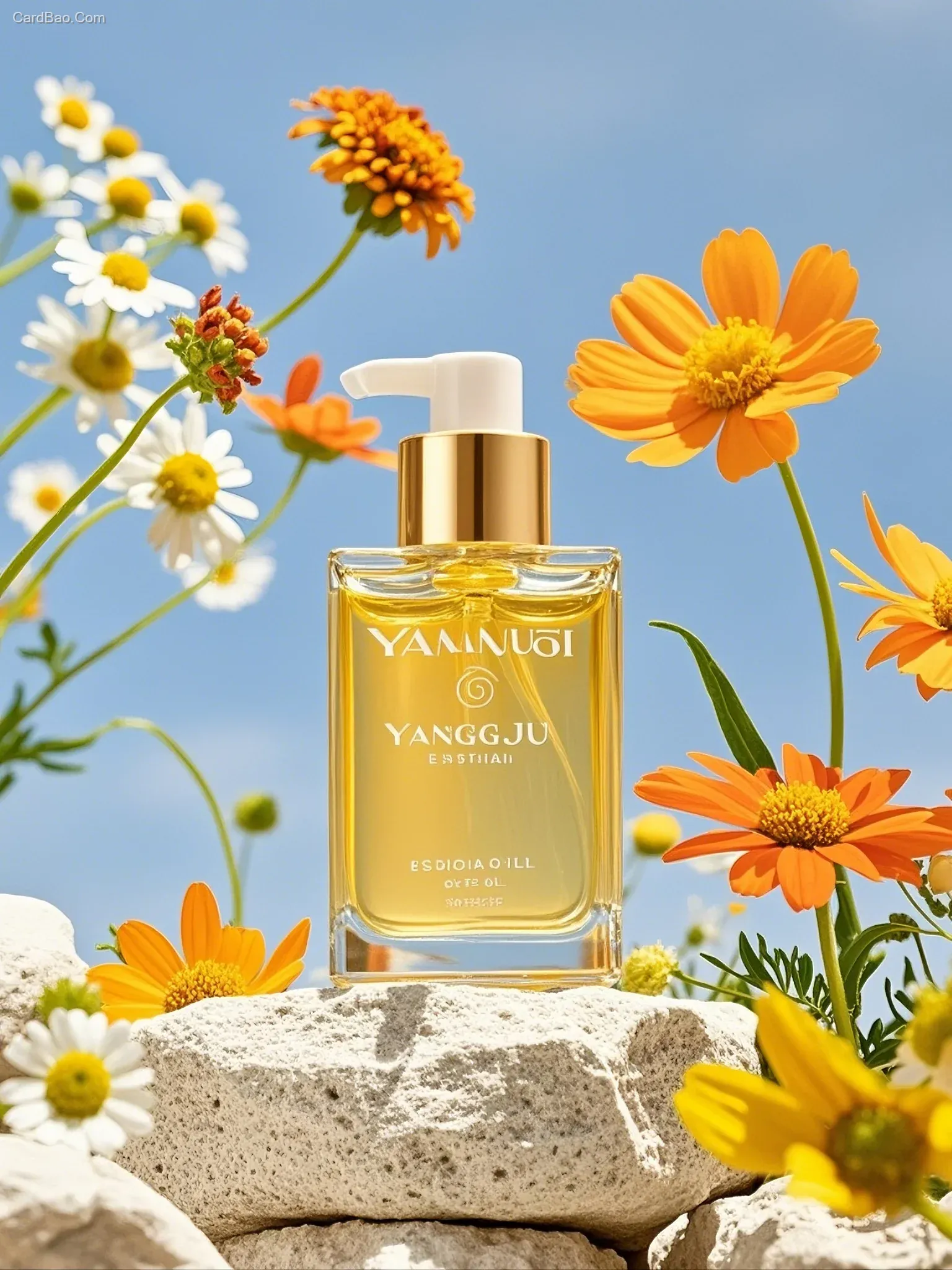 一瓶造型精致的洋甘菊面油瓶置于白色岩石上,周围有橙色和黄色的花朵,背景是蓝天,采用广告宣传风格营造自然夏日氛围,正面电影般构图拍摄,高分辨率聚焦,温暖调色板,明亮色彩,浅色背景,黄金时刻光线,景深,专业拍摄效果,带来干净清晰焦点和商业感图像,“ Yangganju essential oil”字样写在顶部中央