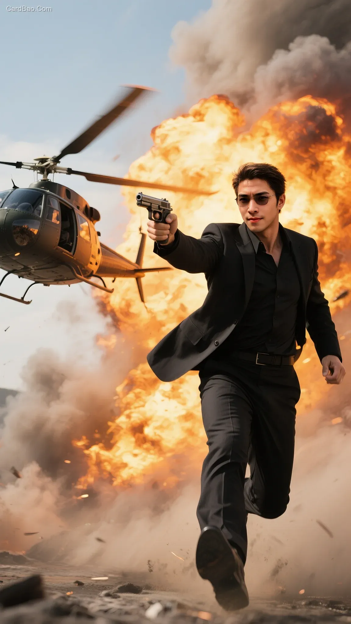 ## Mission Impossible, Tom Cruise in a black suit is exerting all his strength to leap towards a flying helicopter, holding a pistol, with a massive fire from an exploding bomb in the background and smoke billowing everywhere. A high-definition, high-resolution frontal shot of Tom Cruise, with Hollywood cinematic lighting and texture, 100% resemblance.