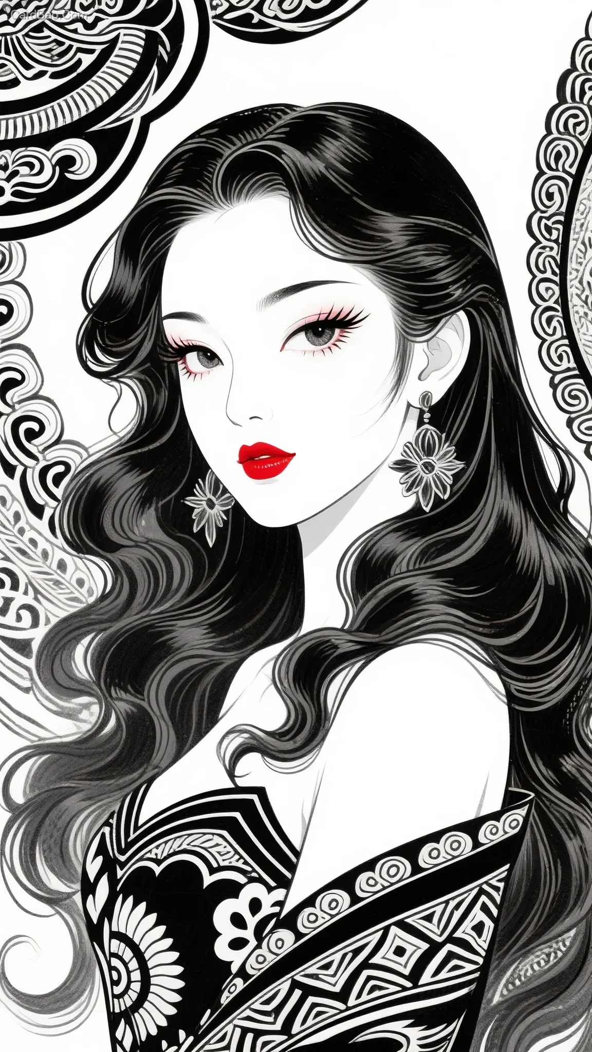 Stunning beauty, thick eyebrows and big eyes, long eyelashes, red lips, long wavy hairstyle, fashionable and modern, traditional batik, Chinese trendy illustration, black and white color scheme, ultra-detailed, traditional patterns, highest quality, hand-drawn illustration style.