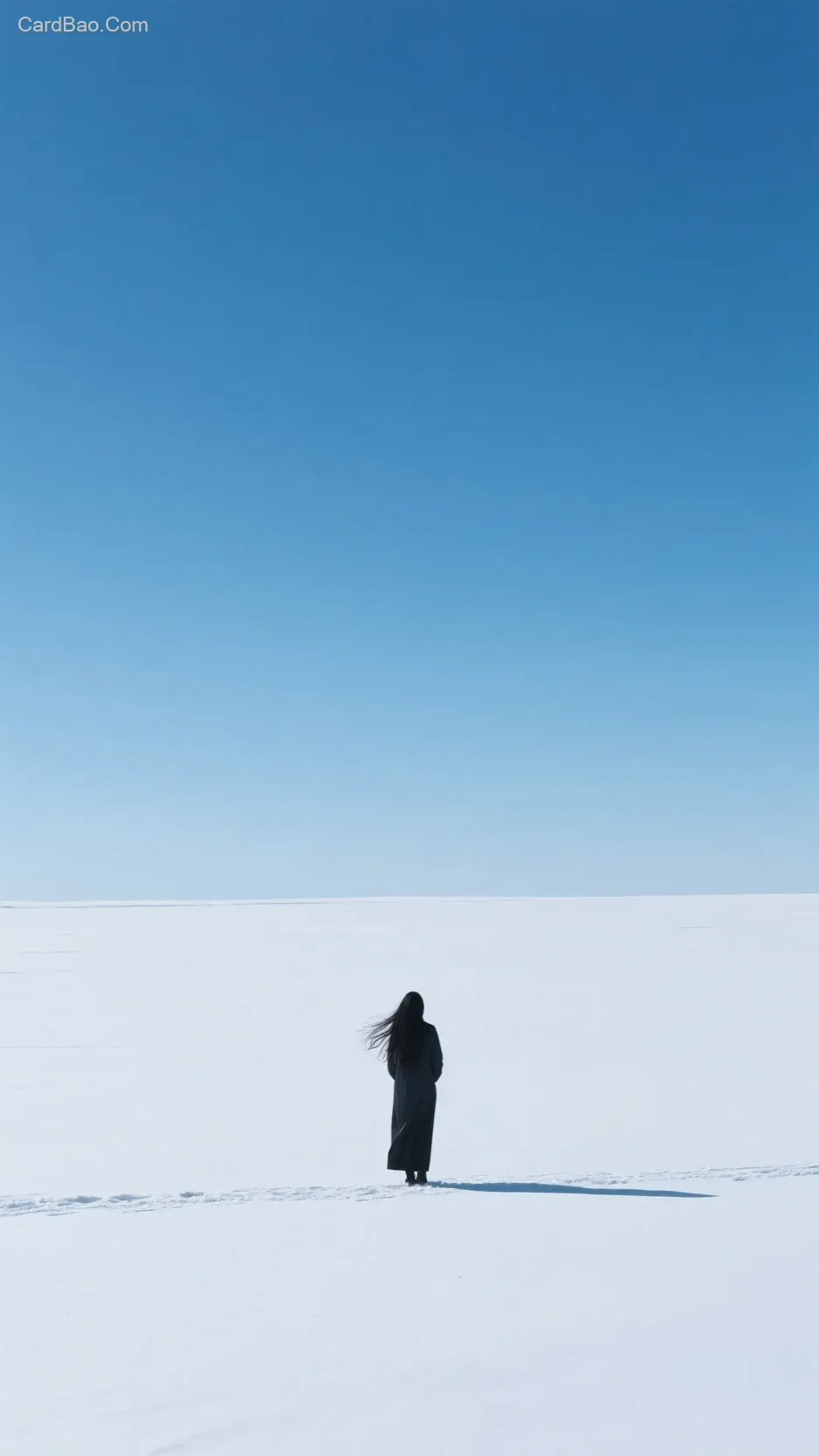 极简风景,蓝色渐变天空,极简,大面积留白,雪地,地平线交接处站立一人,长发飘逸,背影,远景,高级审美,大师级构图