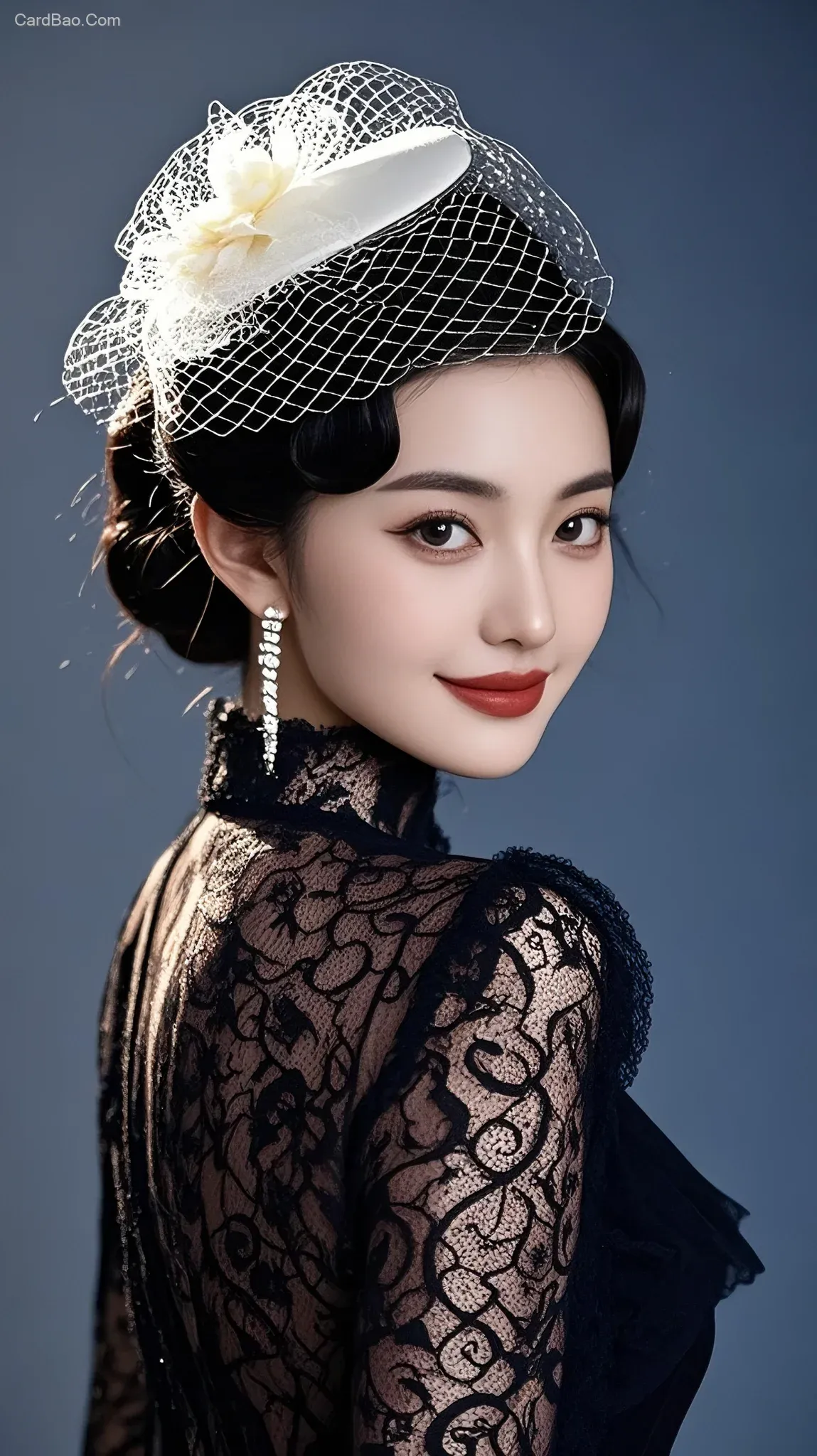 ## Replace the white high-neck clothing and white furry shawl of the woman in the image with a black lace dress. The lace dress should feature vintage patterns and a flared skirt, while preserving other elements such as hairstyle, accessories, makeup, and background, as well as the overall style.
