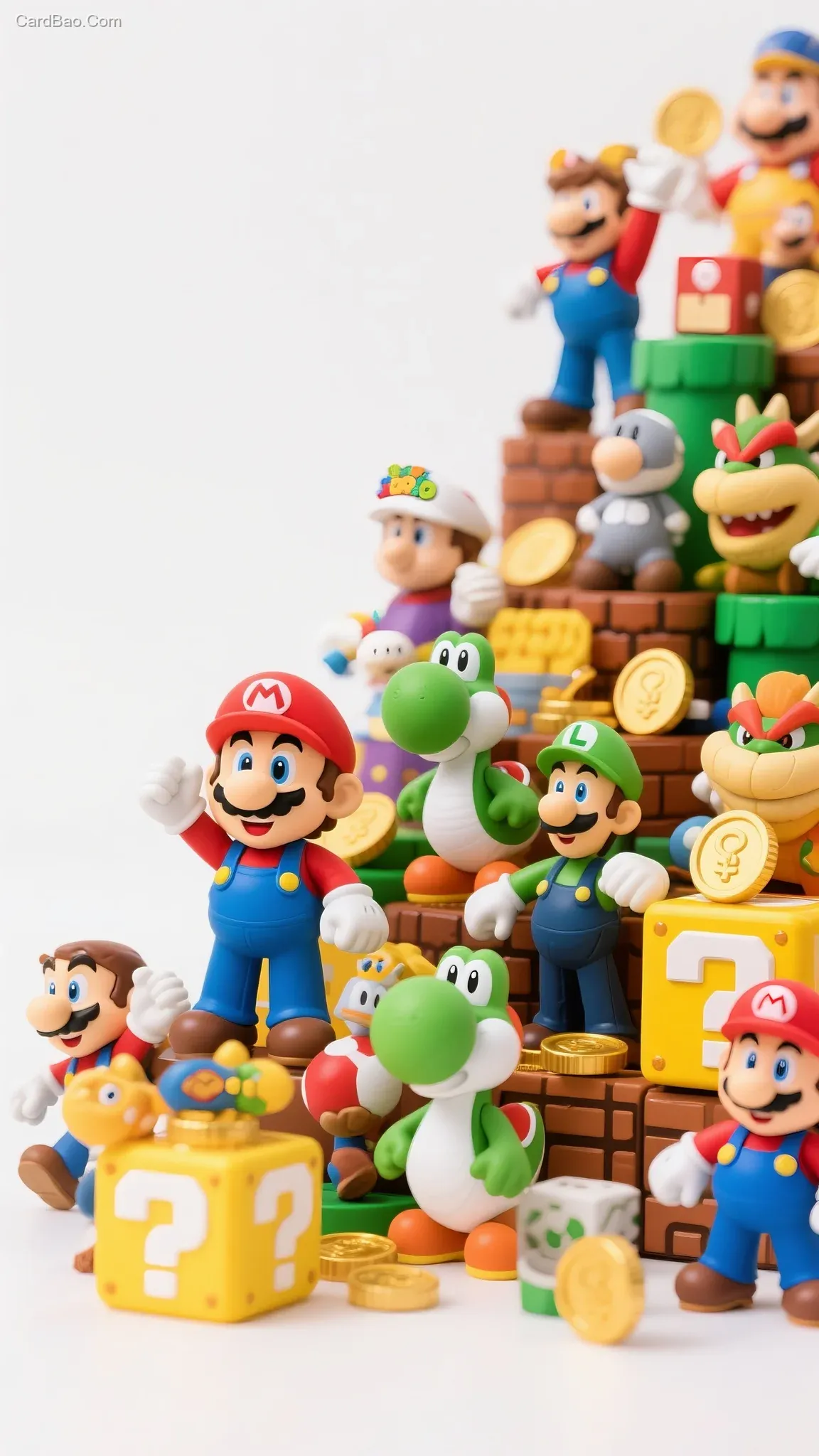 超级马里奥主题的手办模型展示,呈现众多超级马里奥系列角色,像马里奥、路易基、耀西、库巴等,还有金币、问号方块等经典元素,角色丰富,还原游戏形象,角色为3D立体模型,通过注塑、涂装等工艺,精细塑造外形,色彩均匀、细节清晰,关节可动,呈现生动姿态,运用高饱和度、鲜艳明亮色彩,如马里奥的红、蓝,耀西的绿等,还原游戏视觉风格,营造活泼、充满活力氛围,契合IP,采用右侧密集堆积式构图,角色错落摆放、相互穿插,从右上到右下延伸,利用空白背景突出主体,聚焦马里奥系列角色群像