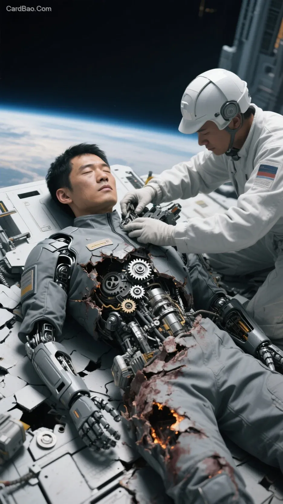 人物脸部轮廓清晰,线条立体。细节完美,基于物理风格的真实渲染,专用构图大师杰作,画面主体以扭曲破坏的姿势睡着一个破碎的仿生机械亚洲男人实体,它穿着人类的灰色作战服,穿白色的维修员正在帮它维修,破坏严重的位置仿真皮肤都被烧毁露出内部构造细节包括机械和细小的齿轮和可控核聚变动力组等结构,背景是太空船空地。