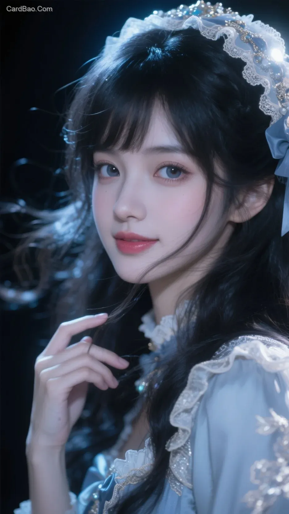 Portrait photography, gentle beauty, 3D high-precision modeling and rendering, lifelike imitation, 1:1 reproduction, body obscured by darkness, face illuminated by soft gradient blue-gray light, extravagant Lolita-style headpiece, lavish Lolita outfit, one hand playing with hair, slender fingers, magical, dreamy, Cosplay, role-playing, macro lens, voluminous jet-black long hair, bright large eyes, eye close-up, enchanting smile, rosy cheeks, gentle, slight upturn of the lips, ultra-high definition, ultra-fine details, realistic skin texture, extreme detailing, fair and delicate skin, smooth and flawless skin, flowing hair, intricate hair strands, serene elegance, atmospheric, 32K resolution, hyper-realistic skin texture, super-detailed, high-level detailing, attention to detail, chiaroscuro contrast, masterful lighting, layered depth, three-dimensionality, exquisite lighting, finely rendered hair, delicate hair strands.