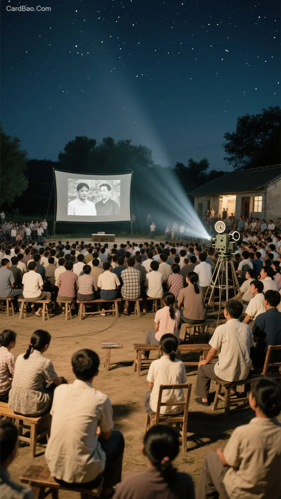 ## Open-air movies in rural China during the 1960s and 1970s, where hundreds of families gathered on the threshing ground with their own stools. The old-fashioned projector cast a fan-shaped beam precisely covering the screen, while the black-and-white film images displayed yellowed human figures!