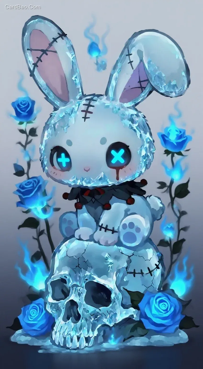 ## All the rabbits turn into ice fishing holes, then place a bit of blue ghost fire inside the rabbits. The roses also turn blue, and the eyes of the skulls become blue ghost fire as well—very eerie.