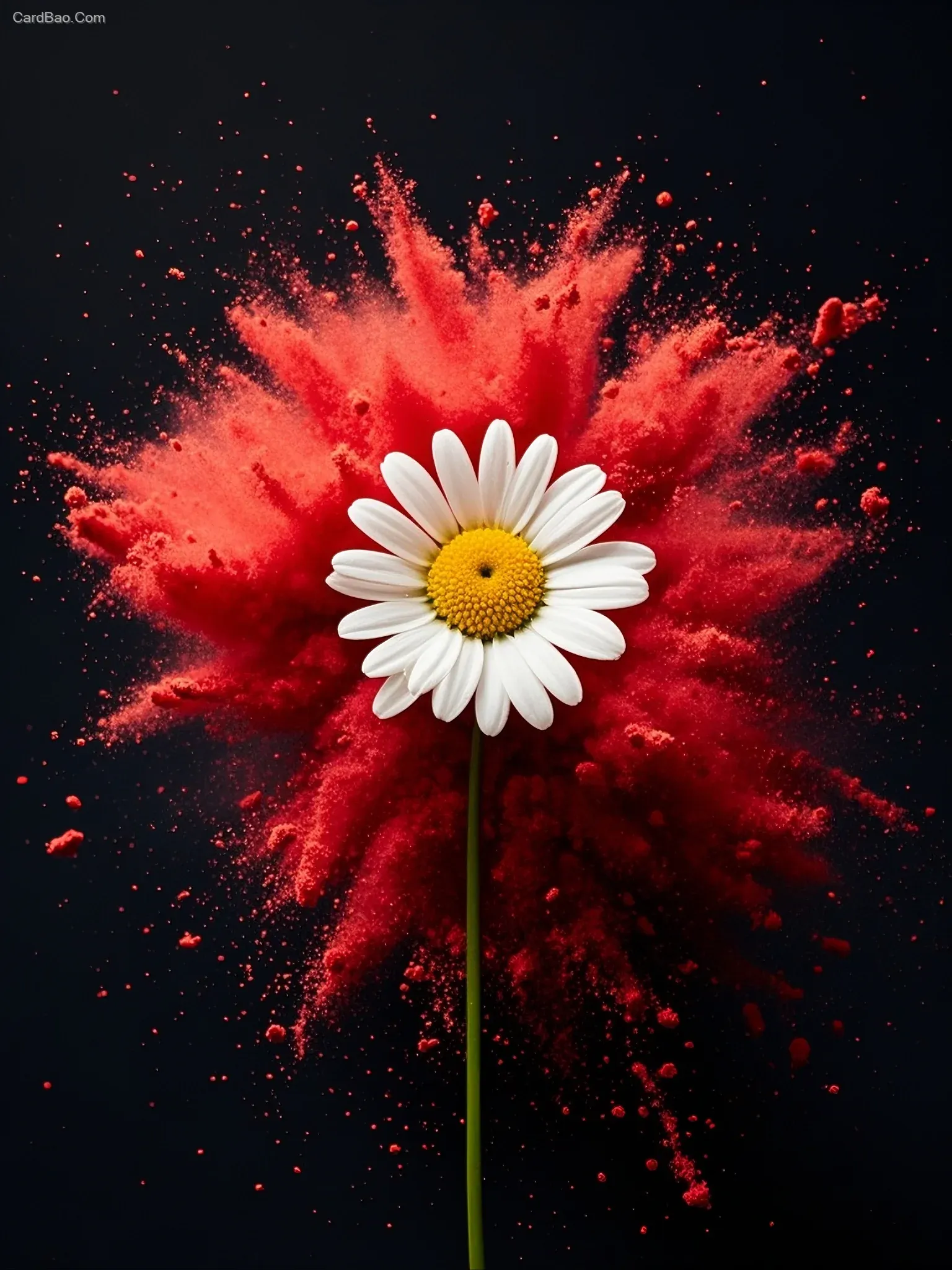 Commercial photography, intense red dust explosion, chamomile, white light, studio lighting, 8K Octane render, high-resolution photography, insane details, intricate detailing, black isolated plain, stock photography, professional color grading.