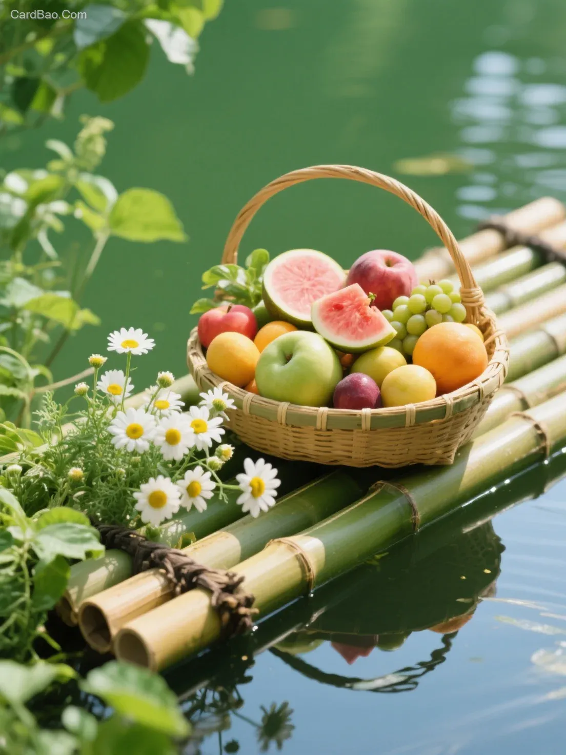 A bamboo basket on a bamboo raft is filled with various summer fruits. Chrysanthemums are scattered nearby, with a green background featuring small flowering plants and water surfaces.