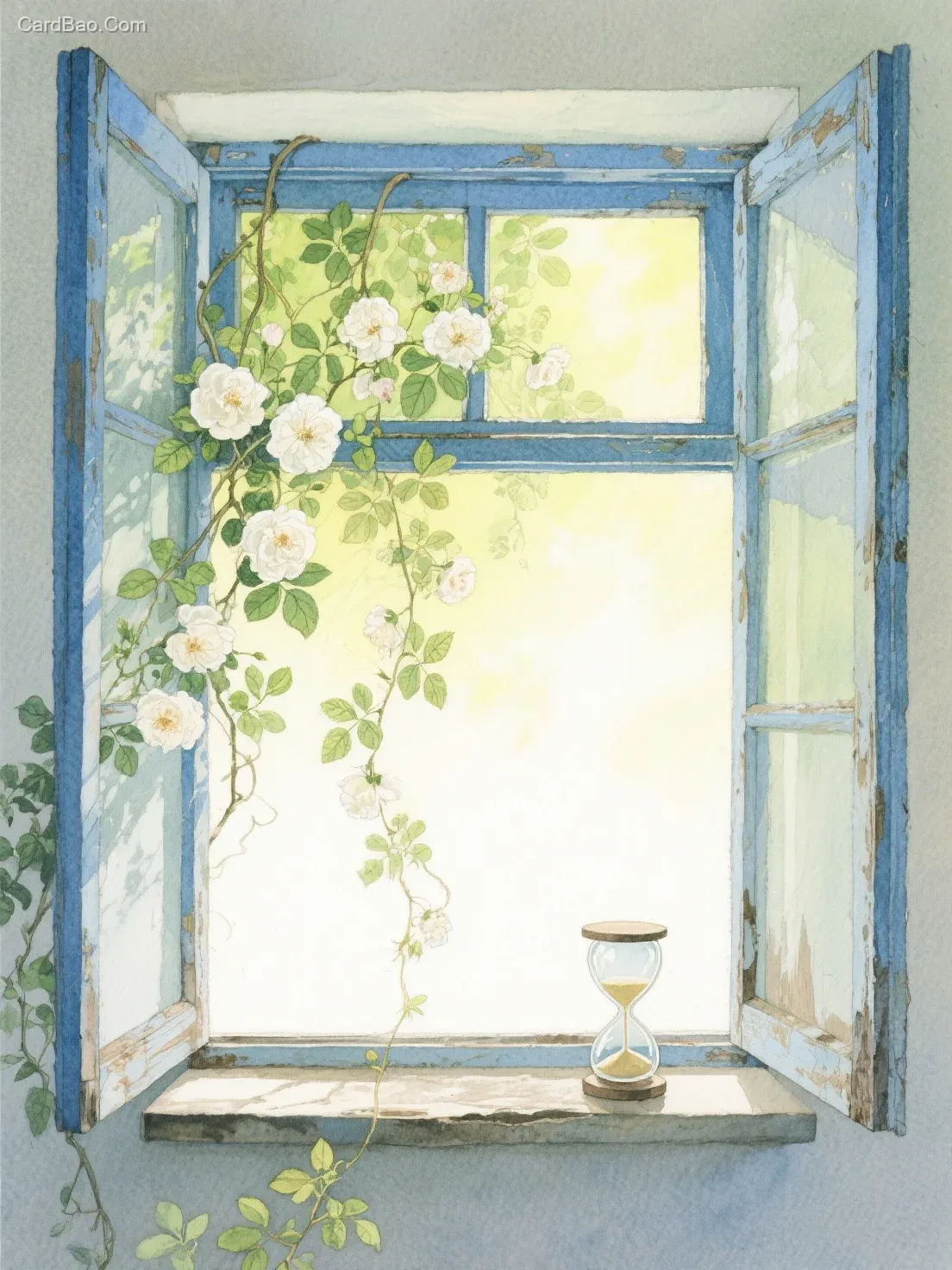 水彩画风格,描绘破旧的复古蓝木质窗框,透过窗口可见垂落的藤蔓与白色蔷薇花,叶脉纹理清晰,窗台上一只玻璃沙漏,背景是朦胧的黄绿渐变色调,大量留白,光影柔和自然,营造出静谧的春日氛围,画面细节细腻,色彩过渡温婉,超高清