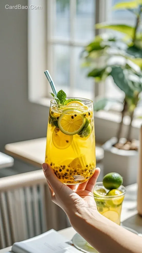 画面主体是一只好看的手拿着一个大的透明玻璃杯,,杯子里装着黄色的饮品,其中浸泡着黄柠檬片,小青桔,百香果粒 ,背景是明亮的茶餐厅,有大窗户,有阳光,植物,超高清,真实感,高融合度,8k分辨率