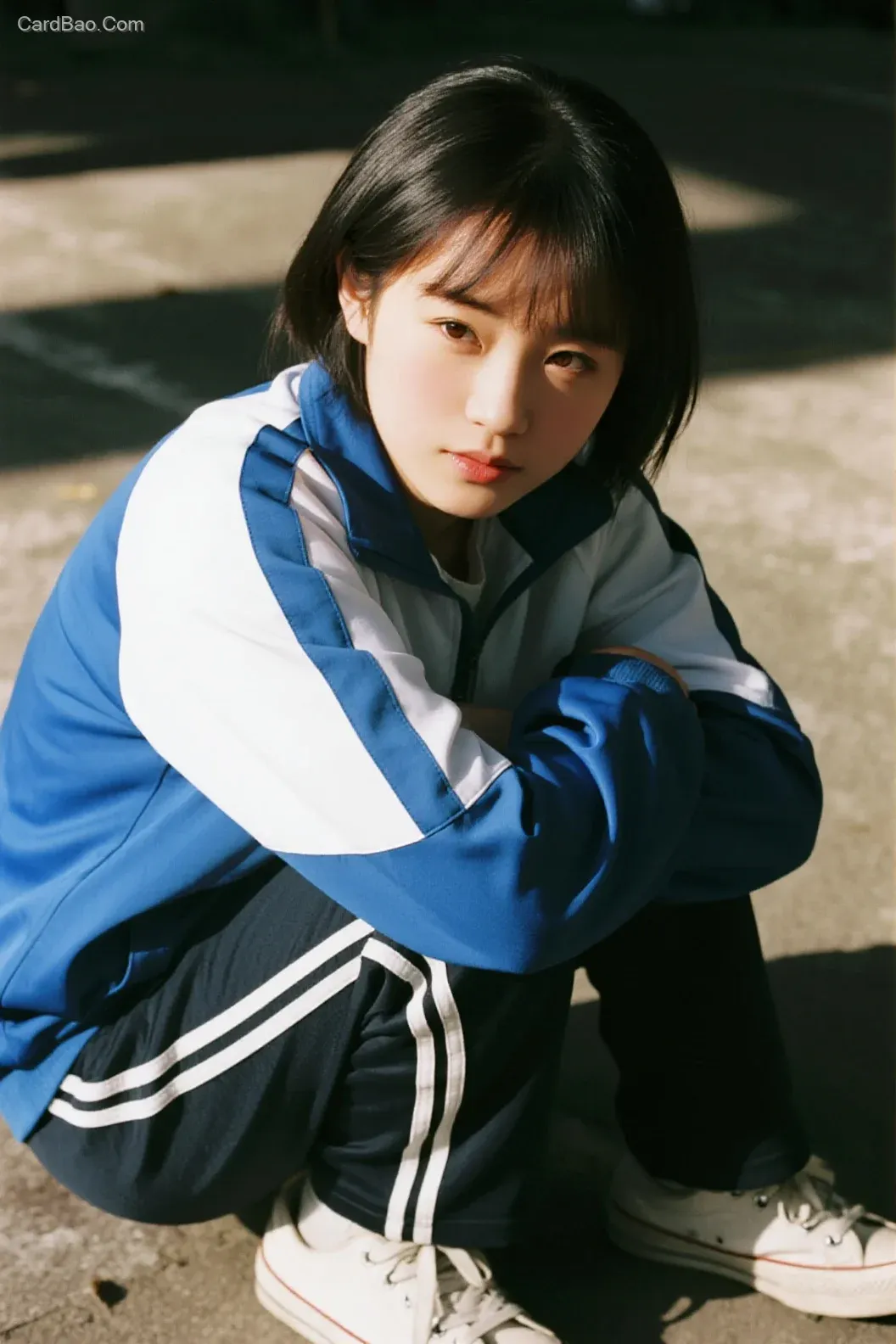 A young Chinese woman wearing a blue-and-white school uniform with sport pants and sneakers, blurred background, film grain texture, vintage color tone, cinematic quality, perfect lighting effects, strong contrast between light and shadow, with a storytelling atmosphere.