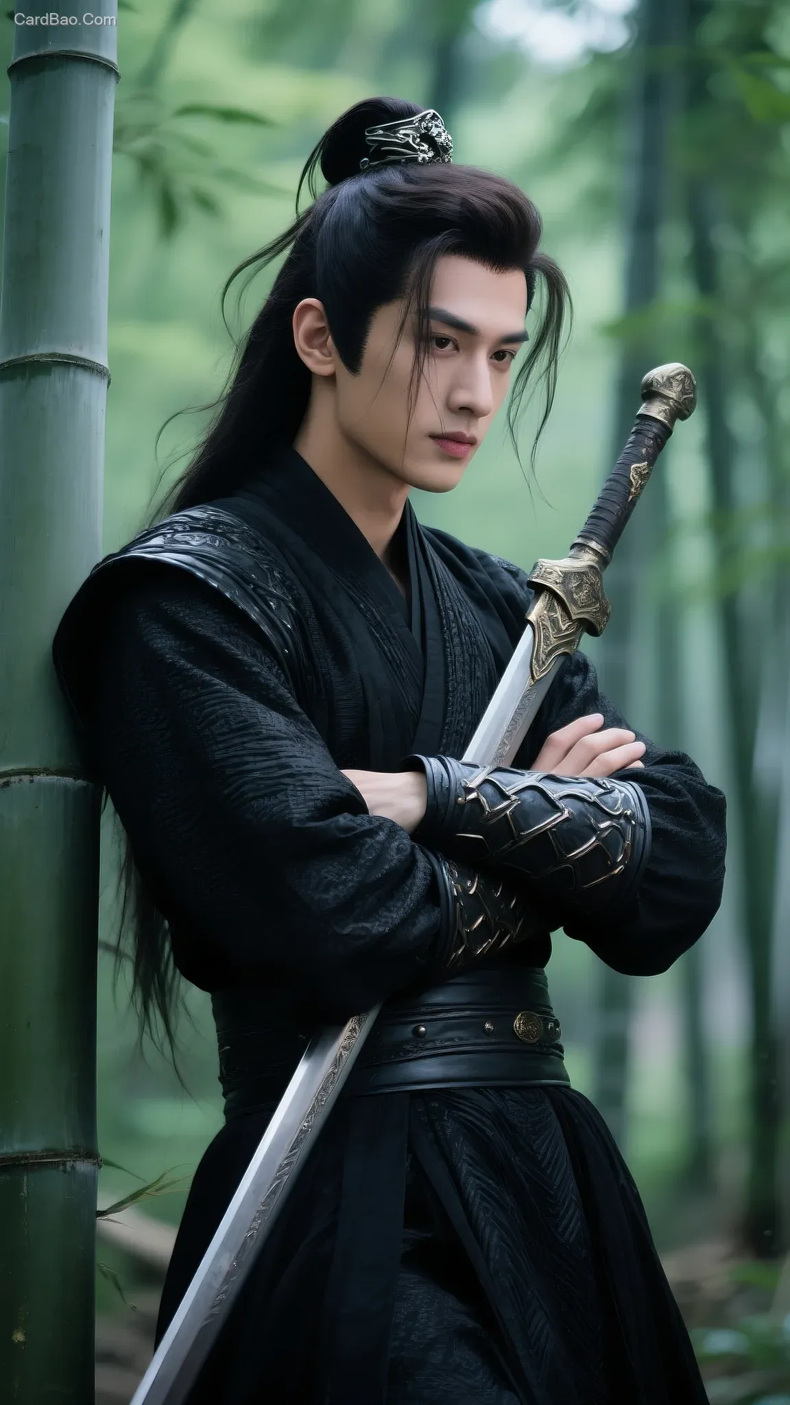 A handsome man dressed in black ancient-style attire, with clearly defined fabric textures and metal-adorned arm guards. His hair is tied back at the nape, topped with an intricate hair ornament, while a few loose strands frame his face. The man stands with his arms crossed over his chest, leaning against a bamboo stalk, with a long sword slanted diagonally behind his back—its hilt adorned with an antique design. The lush green bamboo forest in the background creates a cold, mysterious, and martial atmosphere, perfectly capturing his free-spirited, heroic, and dashing swordsman demeanor.