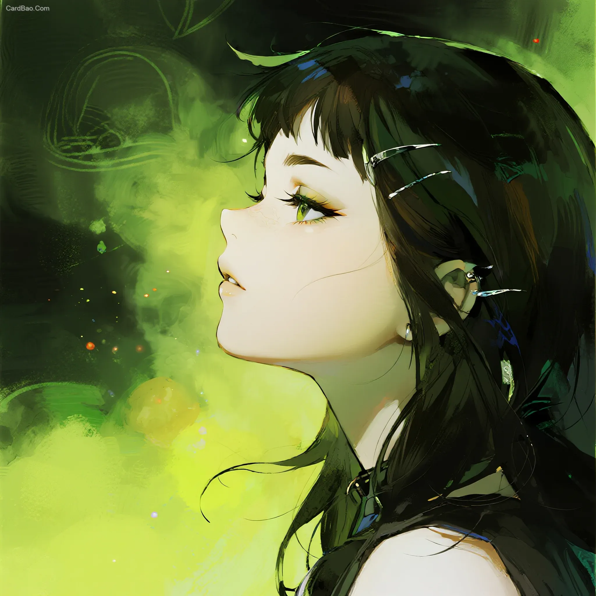 荧光绿色琥珀色,美漫风格,飘逸的头发,梦幻感,雾气缭绕,镜头畸变,水粉,晕染,夸张的五官,下垂眼,睫毛特写,强调睫毛,朋克风格,美少女,光粒子,透视感强烈,野兽派,弥散渐变,颗粒感,自然动态,充满张力的构图,超现实主义。融合Becca Doodlefly的涂鸦线条、Sandara Tang的细腻渐变和天野喜孝的飘逸装饰,8k,平面感,简单背景