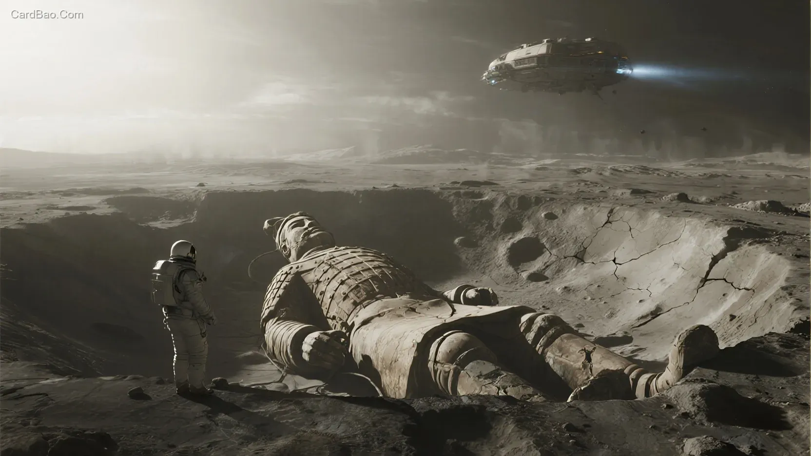 巨大的月坑里躺着一个损坏的兵马俑雕像,宇航员站在兵马俑边上,仰视角度,荒凉的环境,迷雾缭绕,梦核,意识流,逆光拍摄,尘土飞扬,裂缝里有光,2000 科幻风格,远处飞船降落,