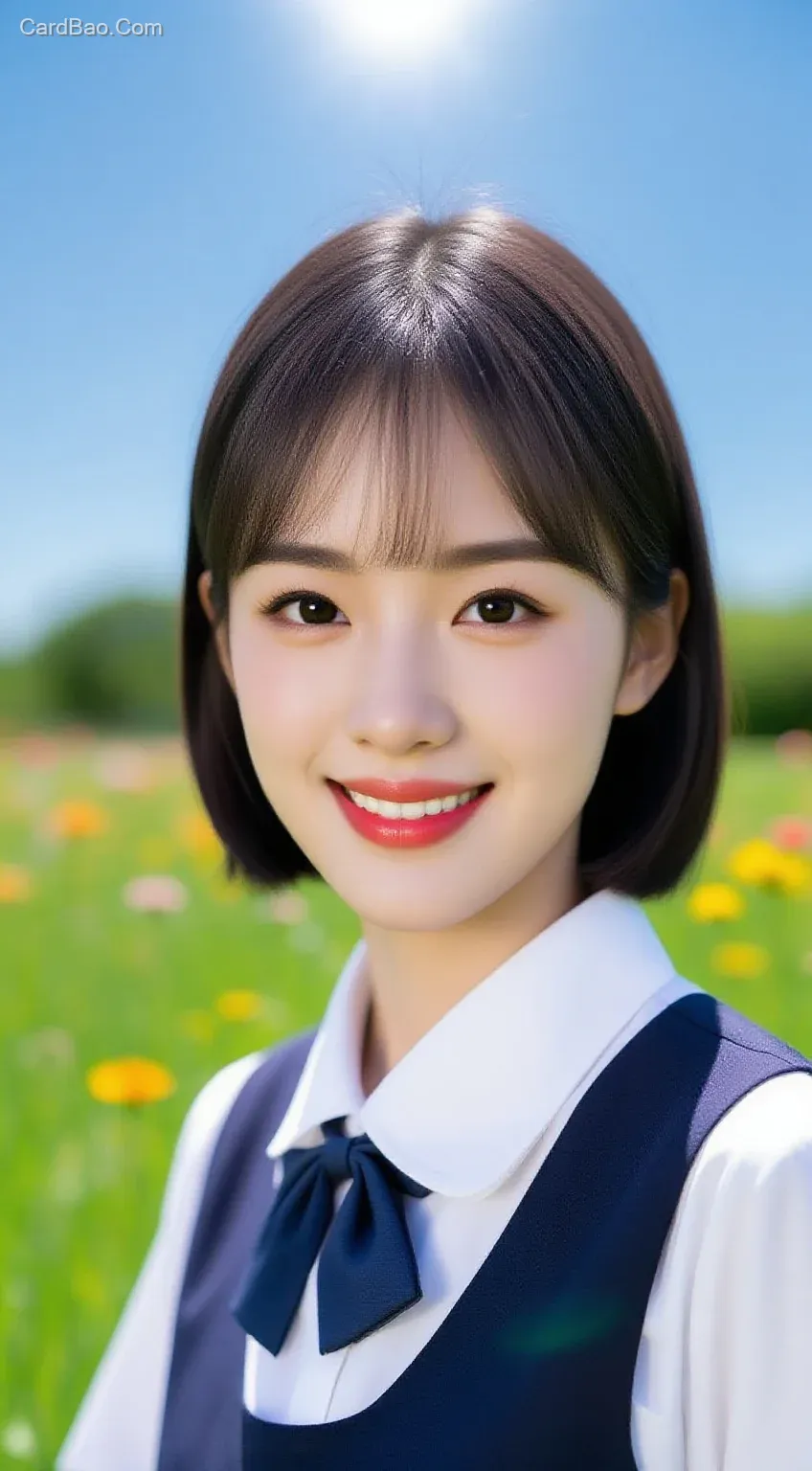 ##32K Ultra HD quality, professional-grade portrait art photography, with exquisite detailing and naturally vibrant colors. A close-up of a youthful woman with fair skin, delicate facial features, and long flowing hair. Her eyebrows and eyes are picturesque, with bright and lively eyes adorned with refined makeup. She wears a Japanese-style school uniform—a white shirt with a red necktie, layered under a black blazer featuring two golden buttons. Below, she sports a plaid pleated skirt, showcasing long and straight thighs, exuding sweet youthfulness. Paired with white ankle socks and black leather shoes, the ensemble fully embodies a college student's charm. A full-body frontal shot captures her standing or walking with the poised and elegant posture of a model, devoid of any other movements. The background features green fields, colorful flowers, sunlight, and a blue sky. Precise depth of field highlights the subject, with natural and soft lighting effects, high sharpness, low noise, and dynamic energy that infuses the scene with vitality, perfectly capturing the youthful vigor and grace of the young woman. Aspect ratio 9:16.