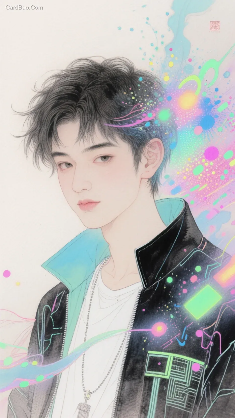 彩色水墨画,工笔人像,东方少年,时尚前卫,魔幻电子,荧光粒子流转