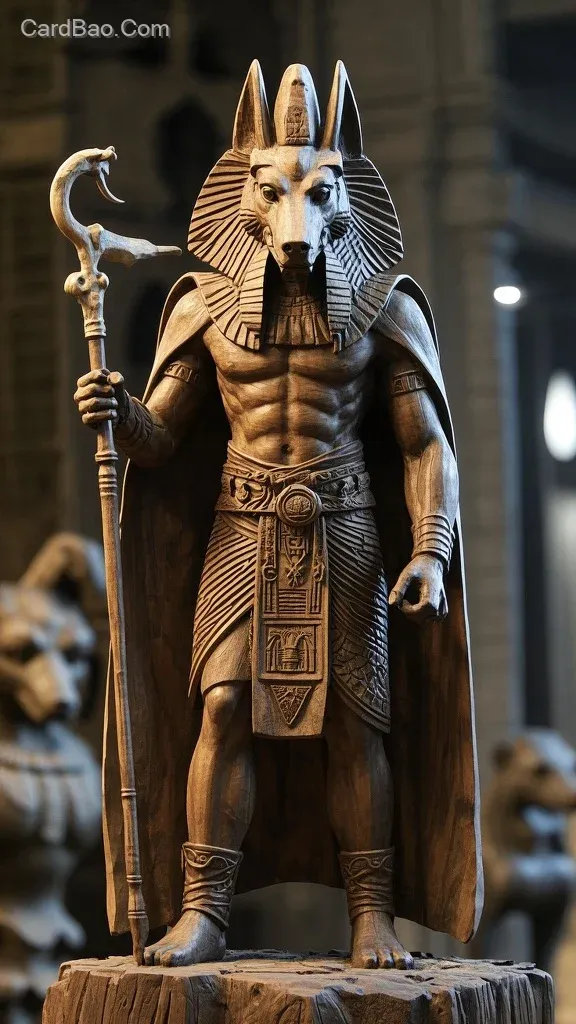 A master-level camphor wood carving depicting Anubis, the wolf-headed god of death from ancient Egypt. The figure wears traditional Egyptian headgear and a flowing hooded robe made of finely draped fabric, adorned with a bone-carved pendant featuring intricate patterns and a brown bone-carved animal-head belt. High-top leather boots complete the attire. One hand grips a long staff, while the other points toward the camera. The piece exudes a mysterious, three-dimensional, dynamic, rustic, refined, visually striking, solemn, and awe-inspiring presence. Inspired by Henry Moore, it blends modernist sculpture with Egyptian mysticism. Created using OC + CG + C4D rendering, the work boasts crisp, intricate details enhanced by diffused and rim lighting. Ray tracing and cinematic lighting techniques are employed to achieve fluid artistic effects. The close-up shot focuses on Anubis’s gesture of pointing at the camera, with side lighting accentuating the wood’s texture and dimensionality, while the blurred background highlights the subject. Aspect ratio: 9:16.