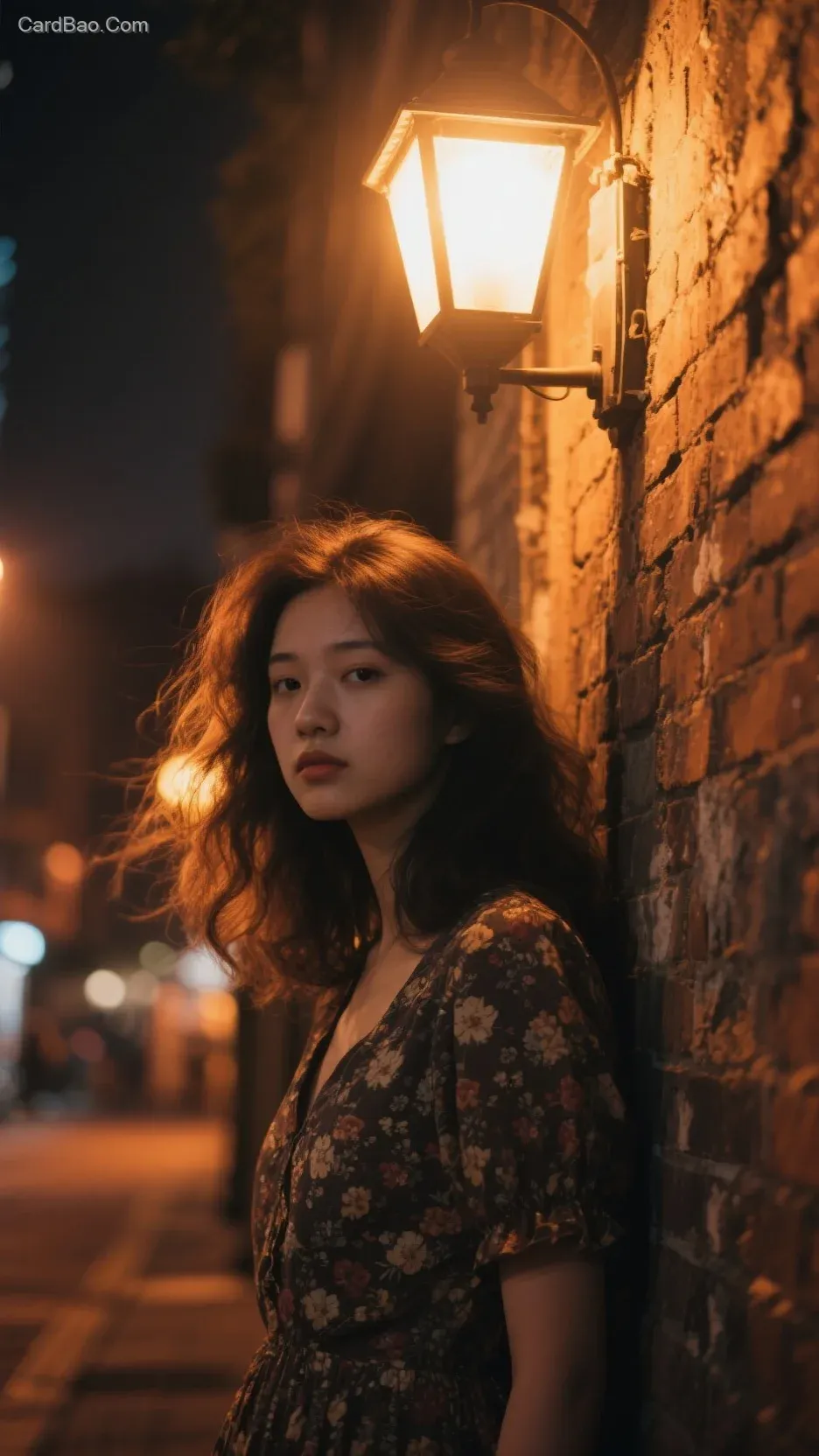 A dimly lit city street corner, where an old-fashioned streetlamp casts a warm yellow glow. In the grainy night, a girl in a vintage floral dress leans quietly against a weathered brick wall. Her tousled hair is gently brushed by the breeze—some strands catching the warm light, others fading into shadow. Her expression carries a faint sense of detachment, her gaze drifting ambiguously toward the camera. The background blurs into a hazy orange-brown hue, while the film grain lends the scene a raw yet romantic street poetry.