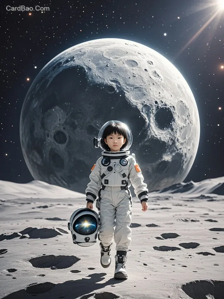 ##根据这个人的人物长相,生成宇航员,宇航员穿着太空服,手里拿着宇航头盔,留着帅气短发,十岁,站在月球表面,远处是黑色的夜空,繁星点点,夜空中还有一个巨大的星球,全身照,朝着镜头方向走来,全景,中焦距,特写镜头,日然光线,室外场景,背景虚化,风格为奇幻科技感,超现实主义数字绘画,高细节和高分辨率,注视着镜头,友好氛围,特写镜头