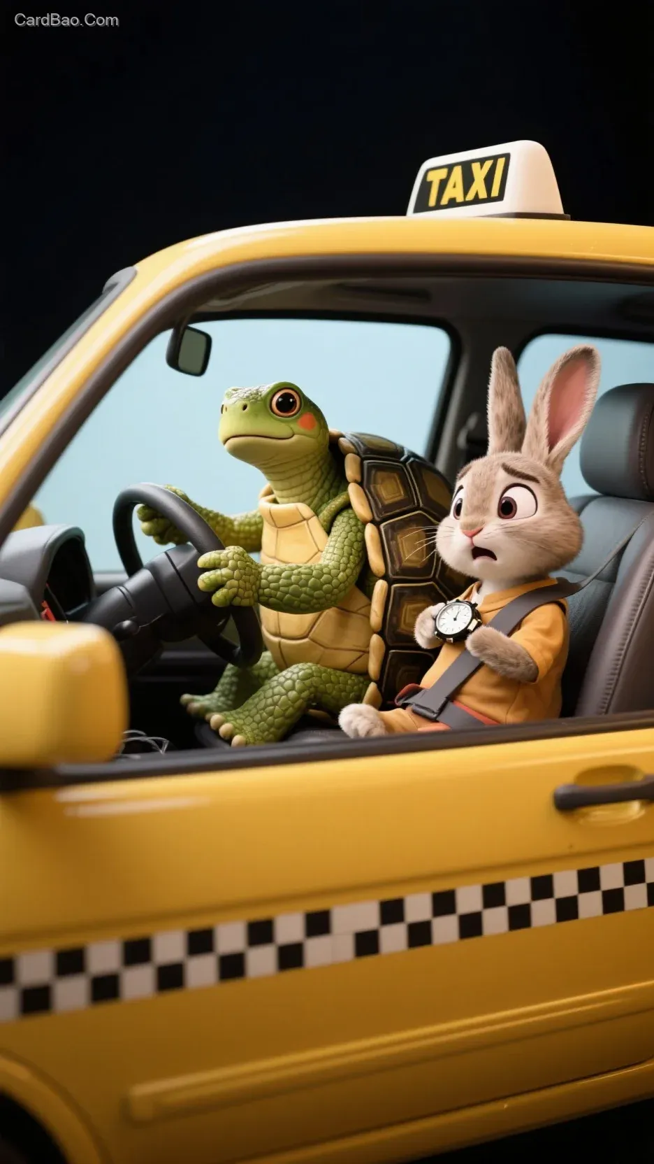 一只乌龟在开出租车,一只兔子坐在副驾的座位上焦急的看着手表。