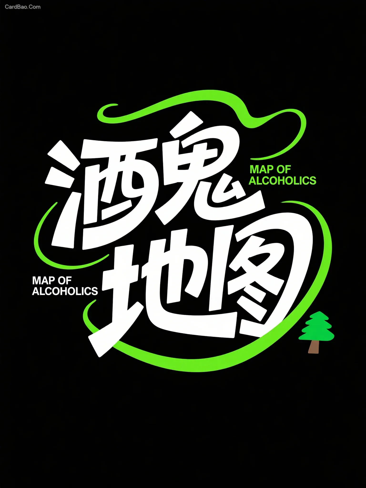 黑底白字,请我帮我写“酒鬼地图”,字体造型夸张,笔画形态不规则,通过扭曲、变形、拉长等手法,打破常规字体结构,极具视觉冲击力,字体笔画富有动感,线条多呈曲线、折线,营造出活泼、跳跃的动态感,仿佛充满生命力。右下角添加英文 “MAP OF ALCOHOLICS” 和一个小的绿色树木图形,整体画面潮流、个性。