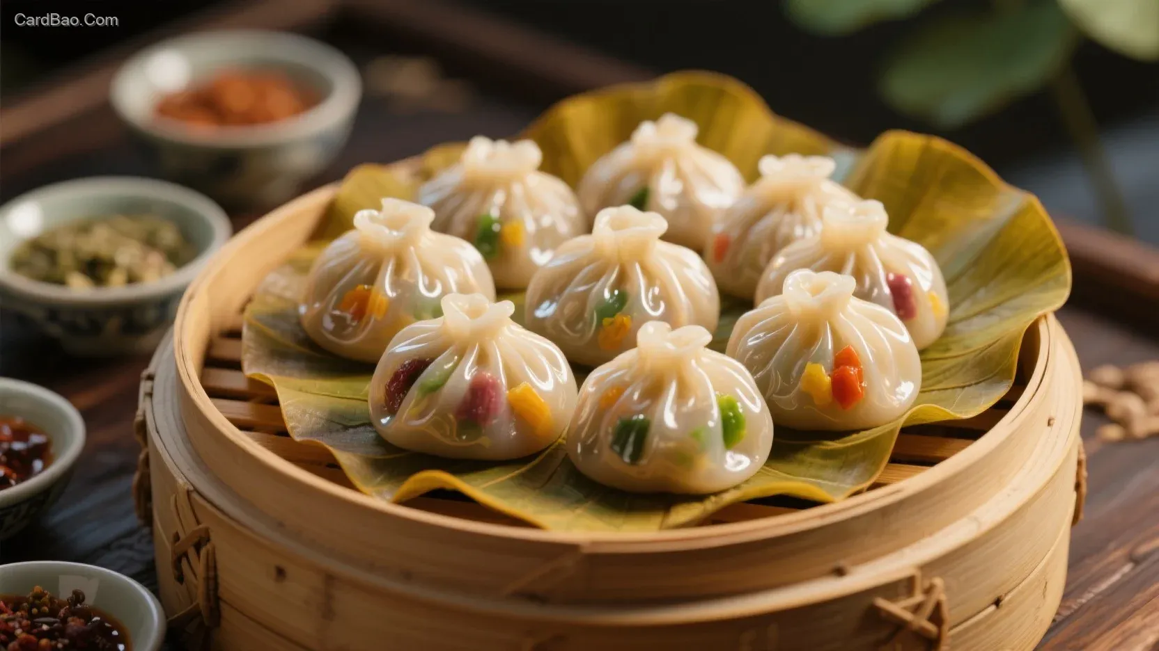 On a bamboo steamer, a pile of xiaolongbao (soup dumplings) is neatly arranged on yellowish-brown lotus leaves. The dumpling wrappers are crystal-clear, revealing the vibrant colors of the fillings inside, creating a striking contrast that enhances the appetite. Several small porcelain dishes holding various condiments are placed beside the bamboo steamer.