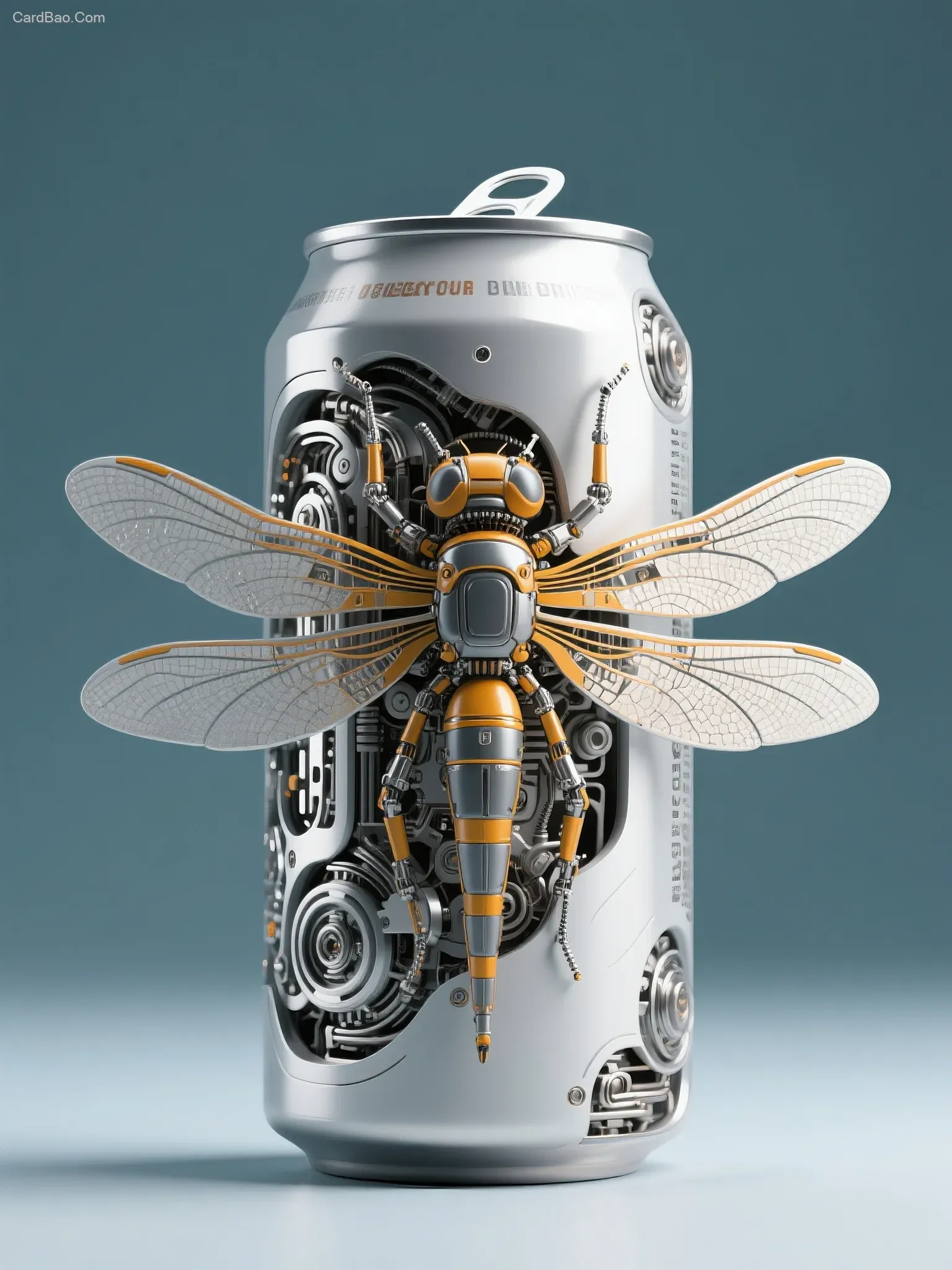 巨大的机械化易拉罐,机械构造,精密机械,上面雕刻一个突出的机械3D蜻蜓,人物主体着色,包装设计,艺术品,凸显易拉罐,纯色背景。
