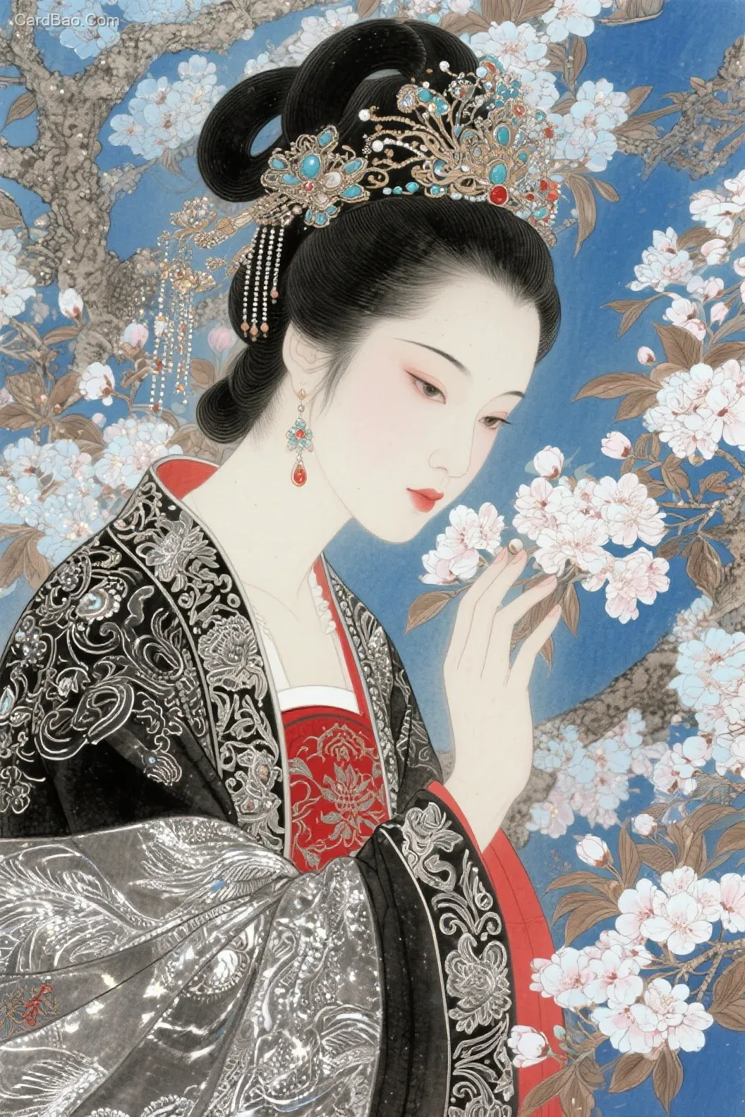 中央美术学院毕业的赵娜风格,细密画与传统水墨技巧巧妙融合,极繁主义,线条主义,华丽宫廷风,手绘,弥散渐变,漫反射,故事感,明暗对比,层次感。主题一场春日赏花,人物动作具有冲击力,极致细节,虚实反复穿插,光影对比强烈,非传统构图的艺术,耀变+反射,微光,蓝色+褐色+银色+黑色,点缀朱红色,宿命感,恢宏感,哲学感,非现实主义,大远景,黑色盘发,华丽的饰品和花纹复杂、带着流光的衣服,细嗅花朵,人物动态,眸光发亮,神采奕奕。