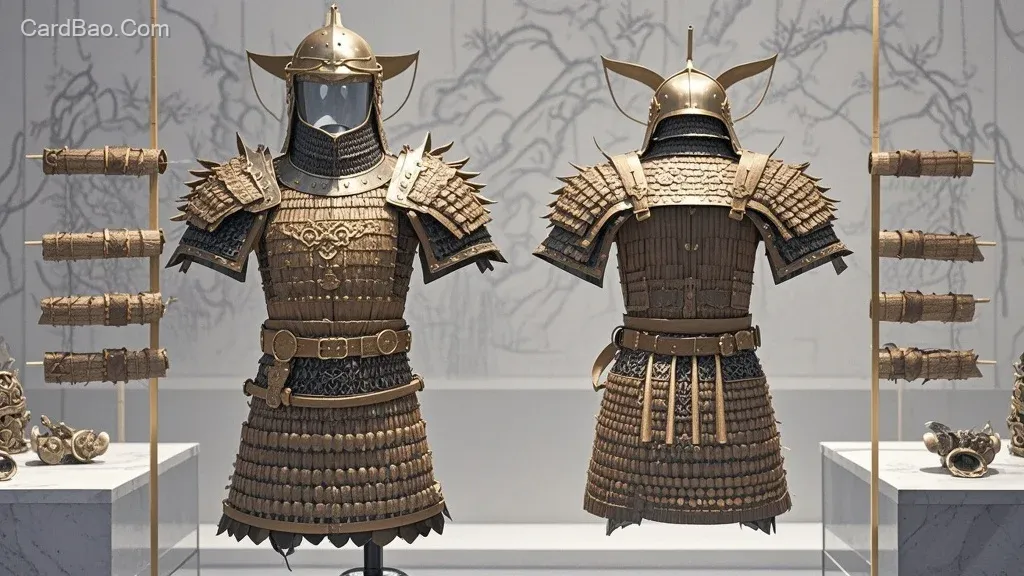 展示架上的传统中国层叠收腰雁翎甲盔甲结构,由树藤编织而成,配备了全封闭面甲、护肩、护肘、护腕、掩心镜、护腰大带、战裙、护膝等部件,所有护甲甲页呈层叠设计,分别展示其正面和背后的细节。狂野的、立体的、富有张力的、粗犷的、精致的、有力量感的、具视觉冲击感的、充满古韵的。比亚兹莱。狂野线描彩铅手绘蓝图风格融合包豪斯元素。OC + CG + C4D渲染,细节清晰详尽,运用弥散光和轮廓光特写,采用光线追踪和电影光效呈现流体艺术效果。中远镜头进行特写,全面呈现盔甲各面细节,侧光光线凸显盔甲质感与立体感。