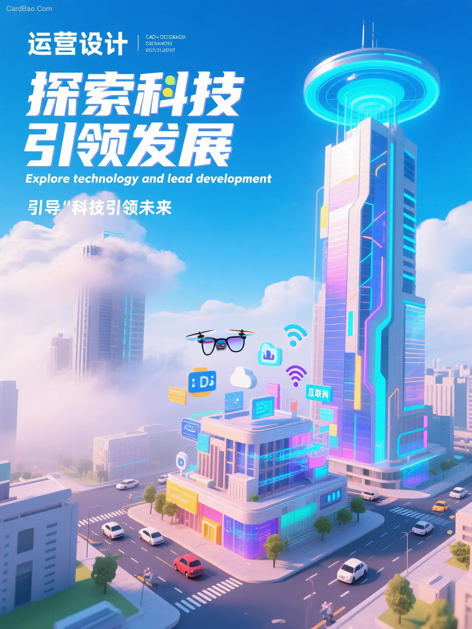 这是一个精心制作的数字CGI插图海报,这个海报的左侧文字内容包含主标题为:“探索科技 引领发展”,副标题为:“Explore technology and lead development”,引导文字:“科技引领未来”,整个字体配色要符合整体画面色调,文字要具有科技感,错落排列,多巴胺彩色的活力配色,整个画面非常具有未来科技感,画面为左右构图,主要是的视觉中心在右边。在明亮的蓝天下,这幅插图散发出未来的气息,以概念性的科技感的建筑、城市最观和熙熙攘攘的汽车交通道路为背景。,右侧的建筑直冲云霄,它的顶部有一个圆形的发着蓝光的科技展台,上左侧的建筑被部分被薄薄的云层雾气挡住,下方的城市最观若隐若现,面有一个微型的建筑群,该建筑群结构表面散发着数据流,建筑上方装饰着无人机,眼镜,,云盘、wif信号,互联网科技等科技元素围绕着该建筑,从自上而下的角度拍摄,整个画面非常具有夸张的视觉冲击力。此外,科技线条、光效、柔和的灯光、明暗对比以及反射和折射都有助于营造出充满活力和俏皮的氛围