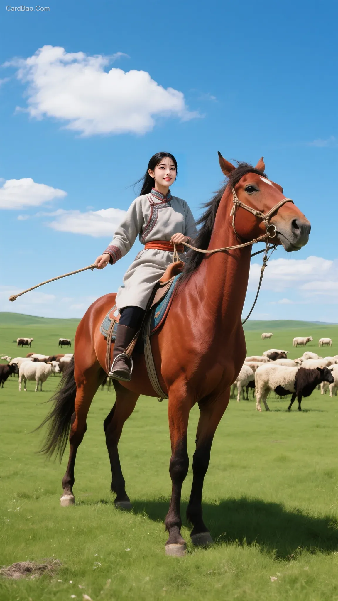 ## Blue sky with white clouds, herds of cattle and sheep, on the lush green grassland, a young modern-dressed Mongolian woman is riding a tall chestnut horse, whipping it to gallop, high-definition image, frontal view, close-up shot