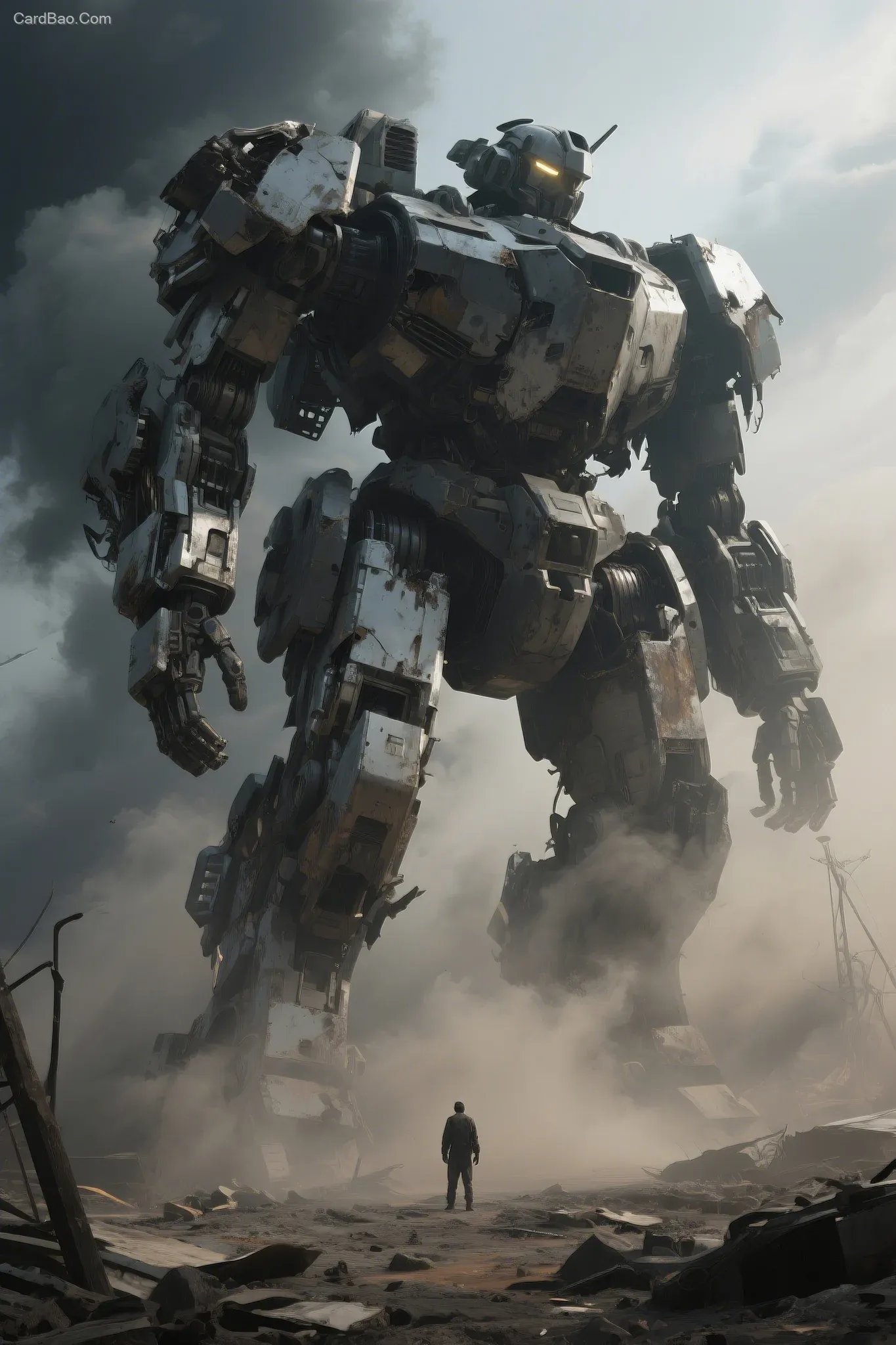 末日废土上,屹立着一座巨型机甲残骸,烟尘弥漫,超写实风格,体现出黑暗后现代主义。机甲体现金属质感,保持厚重感,做旧,战损。大片拍摄,超高清32K,强烈的压迫感。要有人物参照,对比出机甲的巨大。